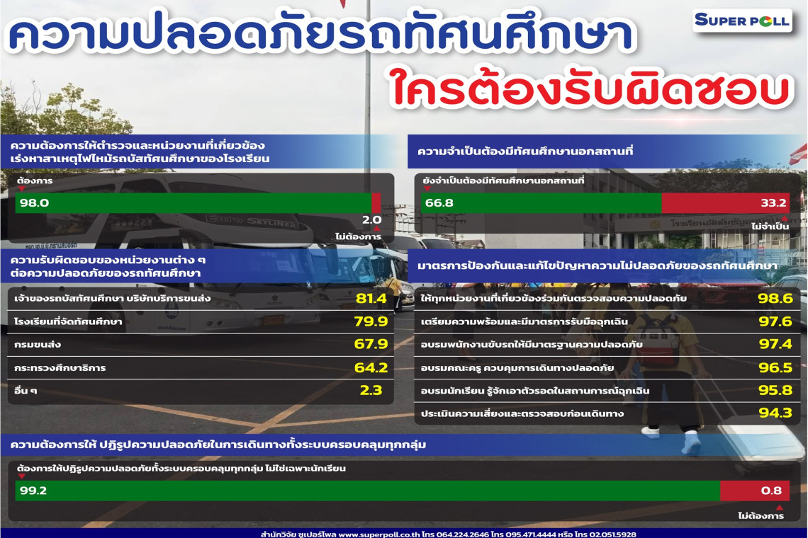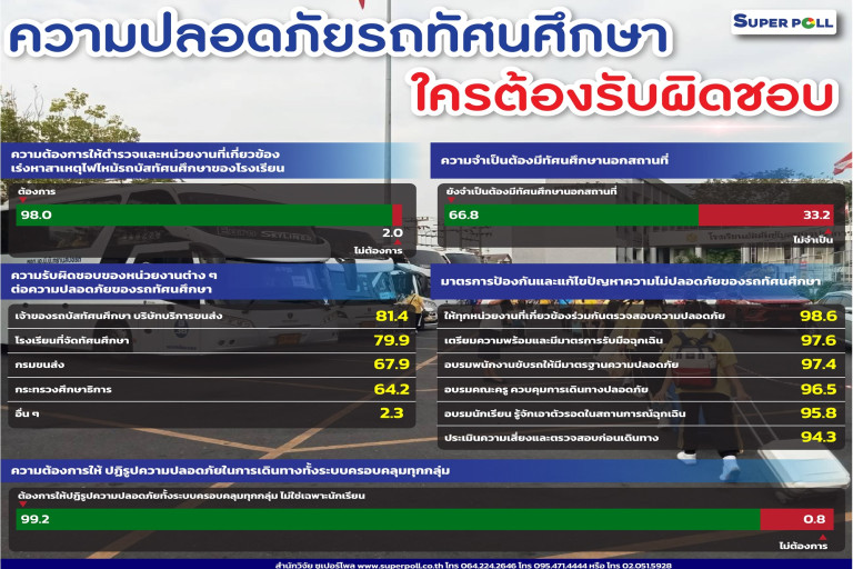 ผลสำรวจจากสำนักวิจัยซูเปอร์โพลเกี่ยวกับความปลอดภัยรถทัศนศึกษาและการรับผิดชอบของแต่ละหน่วยงานได้นำเสนอผลลัพธ์ที่น่าสนใจจากการสำรวจที่เกี่ยวข้องกับหลายด้าน ได้แก่ ความต้องการหาสาเหตุของการเกิดเหตุไฟไหม้รถบัสทัศนศึกษา การมองความจำเป็นของทัศนศึกษานอกสถานที่ ความรับผิดชอบของหน่วยงานต่างๆ มาตรการป้องกันและแก้ไขปัญหาความไม่ปลอดภัยของรถทัศนศึกษา และความต้องการให้มีการปฏิรูปความปลอดภัยการเดินทางระบบ