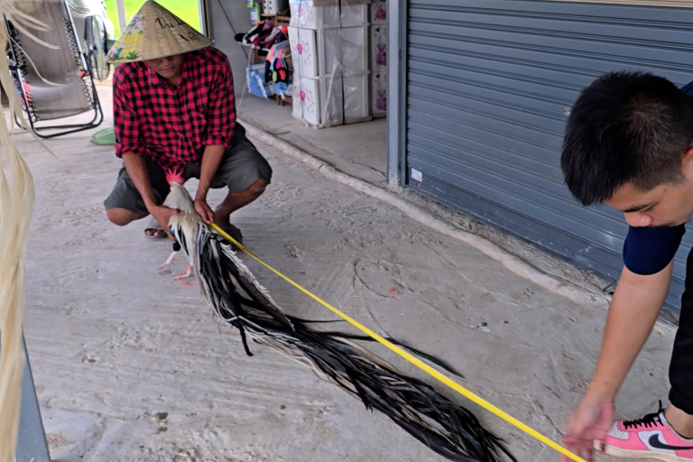 โดยเฉพาะเจ้าไก่เพศผู้ที่ชื่อว่า ณเดชน์ อายุ 3 ปี 8 เดือนที่มีหางยาววัดได้ 3 เมตร 40 ซม.เกาะอยู่แบบสบายๆ ไม่ตื่นตกใจกับคนแปลกหน้า ส่วนขนระย้าก็ยาวเมตรกว่า อีกตัวชื่อเจ้าทองคำ เพศผู้เช่นกัน มีหางยาวเกือบ 2 เมตร ทั้งคู่เกราะอยู่บนคอน ส่งเสียงขันเป็นระยะๆ