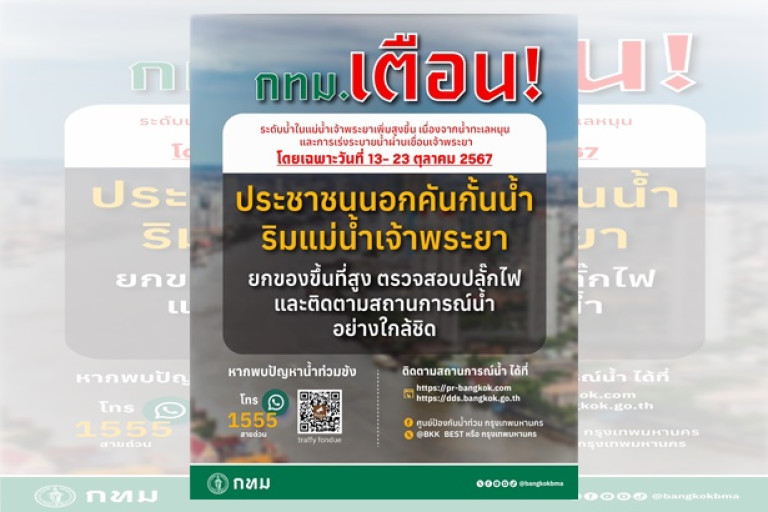 ห้ามประมาท! กทม.ประกาศแจ้งเตือน ประชาชนนอกแนวคันกั้นน้ำ ยกของขึ้นที่สูง หลังน้ำทะเลหนุน-น้ำเหนือถูกปล่อยลงมาจากเขื่อนเจ้าพระยา ระหว่าง 13-23 ต.ค.นี้