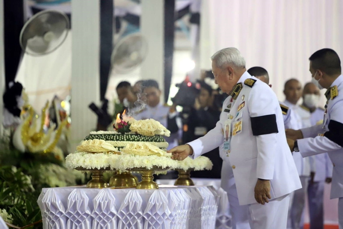 โดยพิธีเริ่มตั้งแต่ช่วงเวลา 12.30 น. โดยพลเอก สุรยุทธ์ จุลานนท์ เป็นประธานในพิธีทอดผ้าไตรพระราชทาน จำนวน 5 ไตร วางกระทงข้าวตอก ดอกไม้ หน้าหีบศพ หยิบธูปเทียนดอกไม้จันทน์จากเจ้าพนักงาน จุดไฟที่โคมจากเจ้าพนักงาน วางดอกไม้จันทน์พระราชทานเพลิง แล้ววางธูปเทียนดอกไม้จันทน์ของพระบรมวงศานุวงศ์ วางที่หน้าหีบศพ ตามด้วย พระสงฆ์ ข้าราชการ ประชาชน ขึ้นวางดอกไม้จันทน์ตามลำดับ ซึ่งพิธีการดังกล่าวนี้จัดขึ้นภายในอาคารอเนกประสงค์โรงเรียนวัดเขาพระยาสังฆาราม