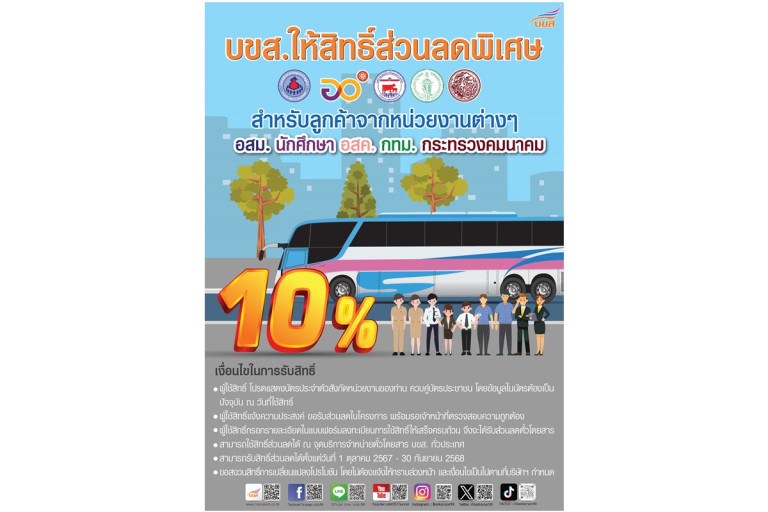 เมื่อวันที่ 10 ตุลาคม 2567 นายอรรถวิท รักจำรูญ กรรมการฯ รักษาการแทนกรรมการผู้จัดการใหญ่ บริษัท ขนส่ง จำกัด (บขส.) กระทรวงคมนาคม เปิดเผยว่า ตามที่นายสุรพงษ์ ปิยะโชติ รัฐมนตรีช่วยว่าการกระทรวงคมนาคม มอบหมายให้ บขส. อำนวยความสะดวก ส่งเสริมและลดค่าครองชีพให้ประชาชนในการเดินทางด้วยระบบขนส่งสาธารณะ บขส. จึงได้จัดกิจกรรม “โปรโมชันส่วนลด 10% สำหรับกลุ่มลูกค้าพันธมิตร” เพื่อเพิ่มรายได้จากการใช้บริการรถโดยสารประจำทาง และสร้างความสัมพันธ์อันดีกับผู้ใช้บริการ กลุ่มผู้โดยสารพันธมิตร หน่วยงานภาครัฐ ภาคเอกชน ที่ปฏิบัติงานให้บริการประชาชน หรือกลุ่มหน่วยงานด้านการศึกษา เพื่อกระตุ้นความต้องการ ใช้บริการ เพิ่มจำนวนผู้โดยสารและจูงใจให้มาใช้บริการทั้งในปัจจุบันและอนาคต