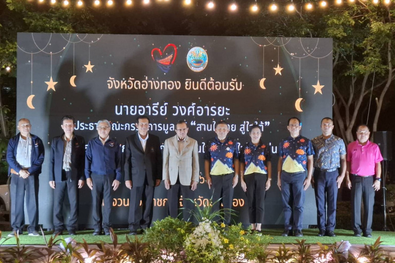 วันที่ 10 ตุลาคม 2567 เวลา 18.00 น. ณ จวนผู้ว่าราชการจังหวัดอ่างทอง อำเภอเมืองอ่างทอง จังหวัดอ่างทอง นายอารีย์ วงศ์อารยะ ประธานกรรมการบริหารมูลนิธิ "สานใจไทย สู่ใจใต้" พร้อมคณะ เดินทางตรวจเยี่ยมครอบครัวอุปถัมภ์ และร่วมงานเลี้ยงรับรองครอบครัวอุปถัมภ์และเยาวชนโครงการ "สานใจไทย สู่ใจใต้" รุ่นที่ 43 จังหวัดอ่างทอง โดยมีนายพิริยะ ฉันทดิลก ผู้ว่าราชการจังหวัดอ่างทอง กล่าวต้อนรับ พร้อมด้วย นางมณฑา ฉันทดิลก นายกเหล่ากาชาดจังหวัดอ่างทอง นายทัศนัย สุธาพจน์ รองผู้ว่าราชการจังหวัดอ่างทอง นายบุญเสริม หนูทอง ประธานกรรมการอิสลามประจำจังหวัดอ่างทอง ปลัดจังหวัดอ่างทอง ตำรวจภูธรจังหวัดอ่างทอง รอง.ผอ.รมน.จังหวัดอ่างทอง หัวหน้าส่วนราชการที่เกี่ยวข้อง นายอำเภอทั้ง 7 อำเภอ นายก อบจ. อปท. เยาวชนและครอบครัวอุปถัมภ์ จำนวนทั้งสิ้น 22 คน 10 ครอบครัว รวมทั้งสื่อมวลชนท้องถิ่น ร่วมให้การต้อนรับ และบรรยายสรุปการดำเนินงานกิจกรรมในพื้นที่