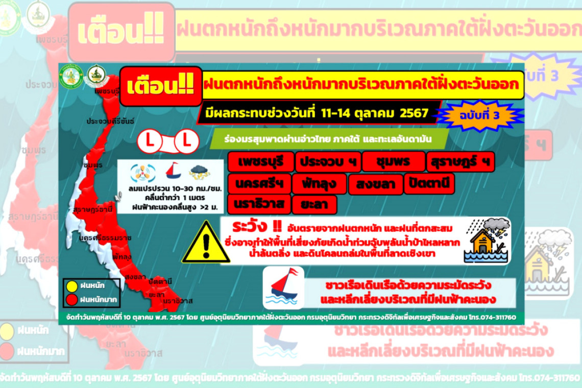 วันที่ 11 ต.ค.67 ศูนย์ปฏิบัติการน้ำอัจฉริยะ (SWOC) กรมชลประทาน เปิดเผยว่า จากการคาดการณ์สภาพอากาศของศูนย์อุตุนิยมวิทยาภาคใต้ฝั่งตะวันออก ประกาศแจ้งเตือนฝนตกหนักถึงหนักมากบริเวณภาคใต้ฝั่งตะวันออก ซึ่งอาจทำให้เกิดน้ำท่วมฉับพลัน น้ำป่าไหลหลาก น้ำล้นตลิ่ง และดินโคลนถล่มในพื้นที่ลาดเชิงเขา ช่วงวันที่ 11-14 ตุลาคม 2567 ในหลายพื้นที่ ได้แก่ จังหวัดเพชรบุรี ประจวบคีรีขันธ์ ชุมพร สุราษฎร์ธานี นครศรีธรรมราช พัทลุง สงขลา ปัตตานี ยะลา และนราธิวาส