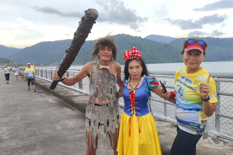 จากนั้นผู้สื่อข่าวได้เข้าไปสอบถามมนุษย์หินฟลิ้นท์สโตนทราบชื่อ จ่าสิบเอกประเสริฐ สดสมศรี อายุ 72 ปี เล่าว่าวันนี้มาวิ่งเทิดพระเกียรติ ตัวเองเป็นคนนครนายกชอบวิ่งและวิ่งทุกงานที่จัดบนสันเขื่อนถามว่าทำไมถึงแต่งตัวแบบนี้ก็แต่งเป็นประจำถ้ามีงานวิ่งและก็อยากสร้างสีสันให้กับคนที่มาร่วมงานจะได้ไม่เครียดบางคนก็มาขอถ่ายรูป ก็ถือว่าการวิ่งเป็นการออกกำลังกายที่ดีที่สุดพร้อมให้สโลแกนว่า " วิ่งแล้วโดนแซง ดีกว่านอนหมดแรงรอหมออยู่บนเตียง " ต่อมาก็ได้พบกับนาง สาวศิรดา คงธนสโรช อาย ุ 63 ปี แต่งตัวแฟนตาซีสโนไวท์วิ่งร่วมงานกับเขาด้วยเผยความรู็สึกว่าวันนี้มาวิ่งเฉลิมพระเกียรติให้กับในหลวง ร .9 และเป็นวันที่ทุกคนชาวไทยร่วมรำลึกถึงพระองค์ท่านเลยแต่งตัวแฟนซีสโนไวท์ร่วมสร้างสีสันให้กับงานนี้