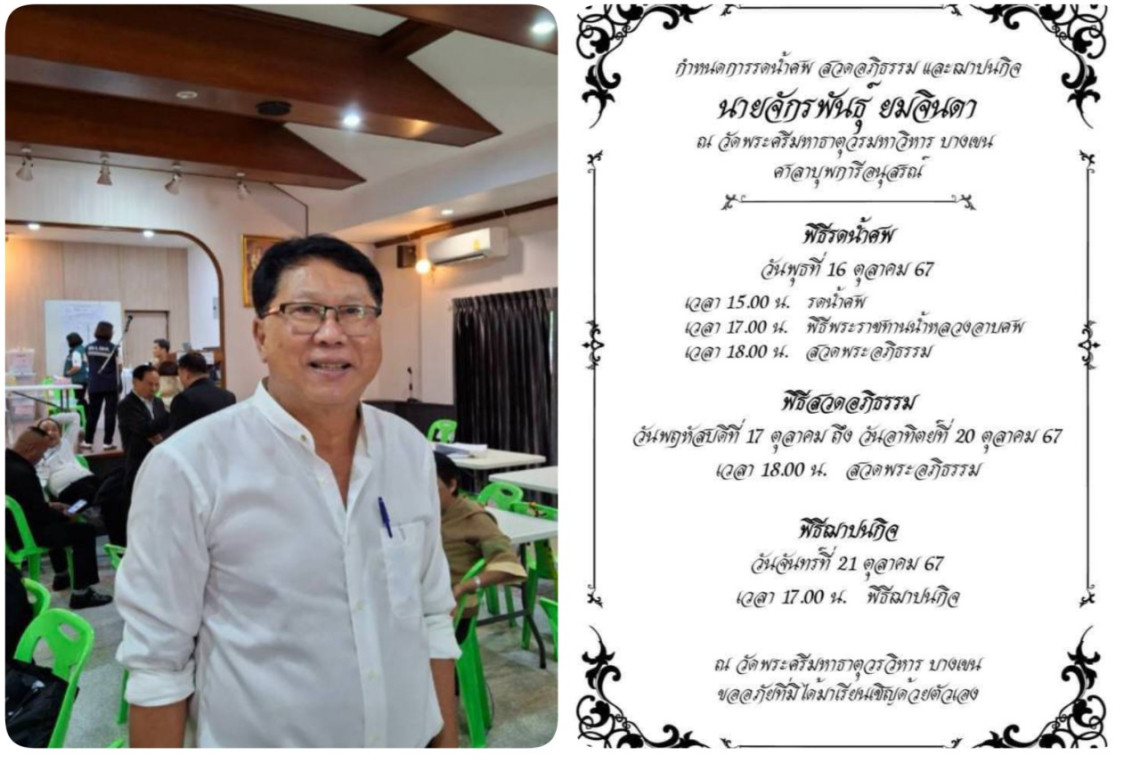 เมื่อวันที่ 16 ตุลาคม 2567 ครอบครัว "นายจักรพันธุ์ ยมจินดา" อดีตนักการเมืองและอดีตผู้ประกาศข่าวชื่อดัง เปิดกำหนดการ รดน้ำศพ สวดอภิธรรม และฌาปนกิจ ที่วัดพระครีมหาธาตุวรมหาวิหาร บางเขน ศาลาบุพการีอนุสรณ์ ตั้งแต่ วันที่ 16-21 ต.ค.67