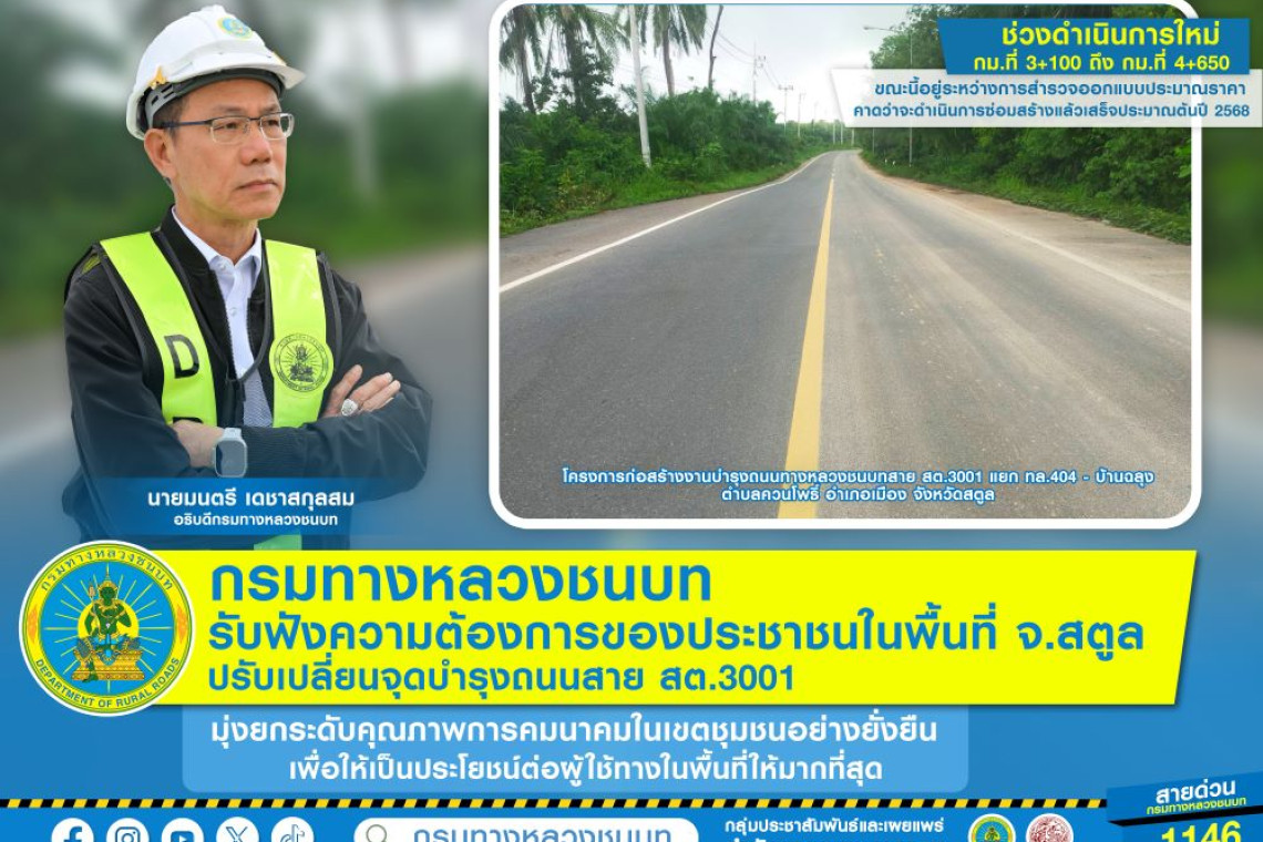 นายมนตรี เดชาสกุลสม อธิบดีกรมทางหลวงชนบท เปิดเผยว่า ได้มอบหมายให้สำนักบำรุงทางลงพื้นที่ตรวจสอบโครงการก่อสร้างงานบำรุงถนนทางหลวงชนบทสาย สต.3001 แยก ทล.404 - บ้านฉลุง ตำบลควนโพธิ์ อำเภอเมือง จังหวัดสตูล จากกรณีที่ประชาชนได้แจ้งความประสงค์ให้กรมทางหลวงชนบท (ทช.) ปรับเปลี่ยนจุดการซ่อมสร้าง เพื่อให้สอดคล้องกับความต้องการและเป็นประโยชน์ต่อประชาชนในพื้นที่ให้มากที่สุด ซึ่งเดิมโครงการดังกล่าวจะดำเนินการบำรุงถนนช่วงบริเวณ กม.ที่ 0+000 ถึง กม.ที่ 3+100 โดยพบว่าประชาชนในพื้นที่ต้องการให้ขยายถนนช่วงบริเวณ กม.ที่ 3+100 ถึง กม.ที่ 4+650 จากเดิมกว้าง 8 เมตร เป็น 12 เมตร (2 ช่องจราจร ไป – กลับ) ดังนั้น ทช. จึงได้เปลี่ยนแปลงพื้นที่ดำเนินการ ขณะนี้อยู่ระหว่างการสำรวจออกแบบประมาณราคา โดยคาดว่าจะดำเนินการซ่อมสร้างแล้วเสร็จประมาณต้นปี 2568 ซึ่งใช้งบประมาณในการดำเนินงานรวม 24.492 ล้านบาท