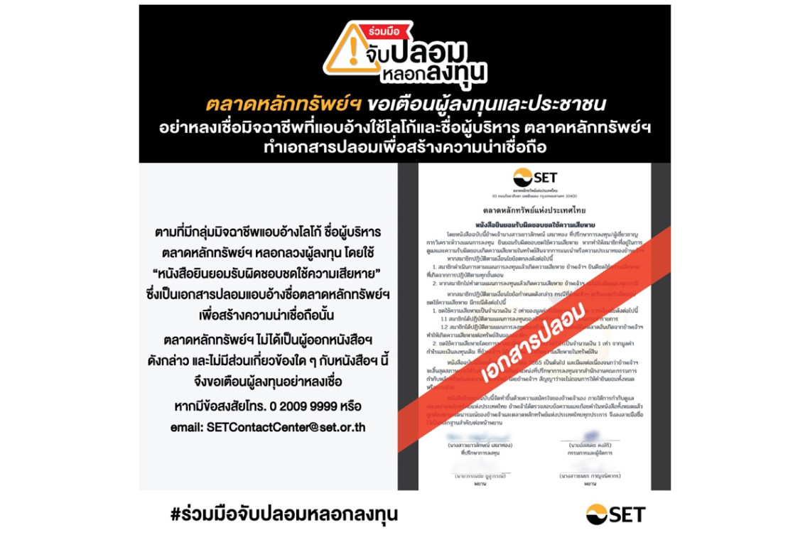 เมื่อวันที่ 17 ตุลาคม 2567 ตลาดหลักทรัพย์แห่งประเทศไทยแจ้งว่า ตามที่มีกลุ่มมิจฉาชีพแอบอ้างโลโก้ ชื่อผู้บริหาร ตลาดหลักทรัพย์ฯ หลอกลวงผู้ลงทุน โดยใช้ "หนังสือยินยอมรับผิดชอบชดใช้ความเสียหาย" ซึ่งเป็นเอกสารปลอมแอบอ้างชื่อตลาดหลักทรัพย์ฯ เพื่อสร้างความน่าเชื่อถือนั้น ตลาดหลักทรัพย์ฯ ไม่ได้เป็นผู้ออกหนังสือฯ ดังกล่าว และไม่มีส่วนเกี่ยวข้องใดๆกับหนังสือฯนี้ จึงขอเตือนผู้ลงทุนอย่าหลงเชื่อ หากมีข้อสงสัยโทร. 0-2009-9999 หรือ email: SETContactCenter@set.or.th