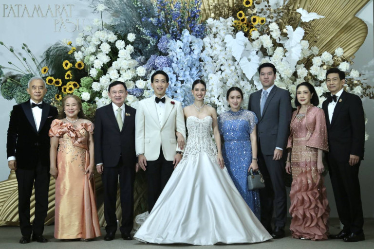 ผู้สื่อข่าวรายงานว่า นายทักษิณเดินทางเข้างานพร้อมกับน.ส.แพทองธาร โดยมีนายสุวัจน์ออกมาต้อนรับ และได้เขียนอวยพรให้กับคู่บ่าวสาวพร้อมกัน โดยนายทักษิณอวยพรว่า “ลุงขออวยพร ให้หลวงและน้องฝ้ายมีความสุขในชีวิตสมรสตลอดไป รักกันมากๆ เป็นกำลังใจให้กันในการสร้างครอบครัวและอนาคตให้มั่นคง ลุงขอเป็นกำลังใจด้วยรักและปรารถนาดี”