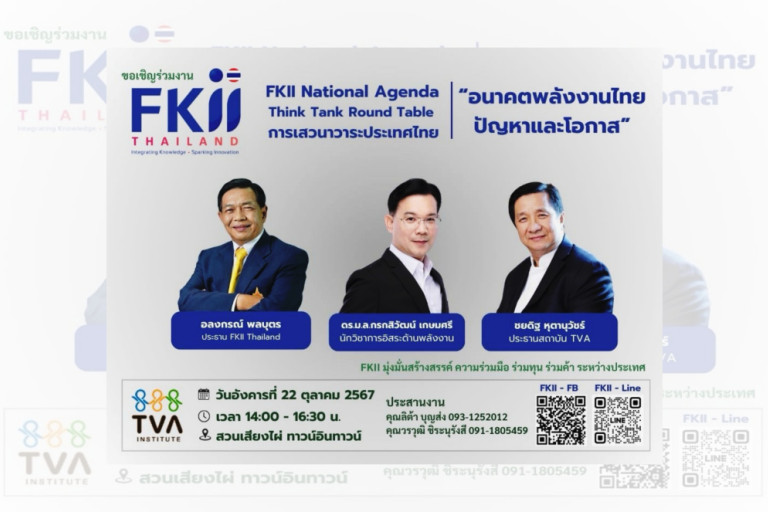 สถาบันเอฟเคไอไอ. ไทยแลนด์ (FKII Thailand) และสถาบันทิวา (Transformation Valley) จัดเสวนาโต๊ะกลมวาระประเทศไทยหัวข้อ “อนาคตพลังงานไทย:ปัญหาและโอกาส !!!“ โดยวิทยากรชื่อดัง ดร.ม.ล.กรกสิวัฒน์ เกษมศรี นักวิชาการอิสระด้านพลังงาน และนายอลงกรณ์ พลบุตร ประธานสถาบัน FKII Thailand รองประธานคณะกรรมการยุทธศาสตร์ ปชป.และอดีตรองประธานสภาขับเคลื่อนการปฏิรูปประเทศ มีนายชยดิฐ หุตานุวัชร์ ประธานสถาบันทิวา (TVA) เป็นผู้สรุปการเสวนา