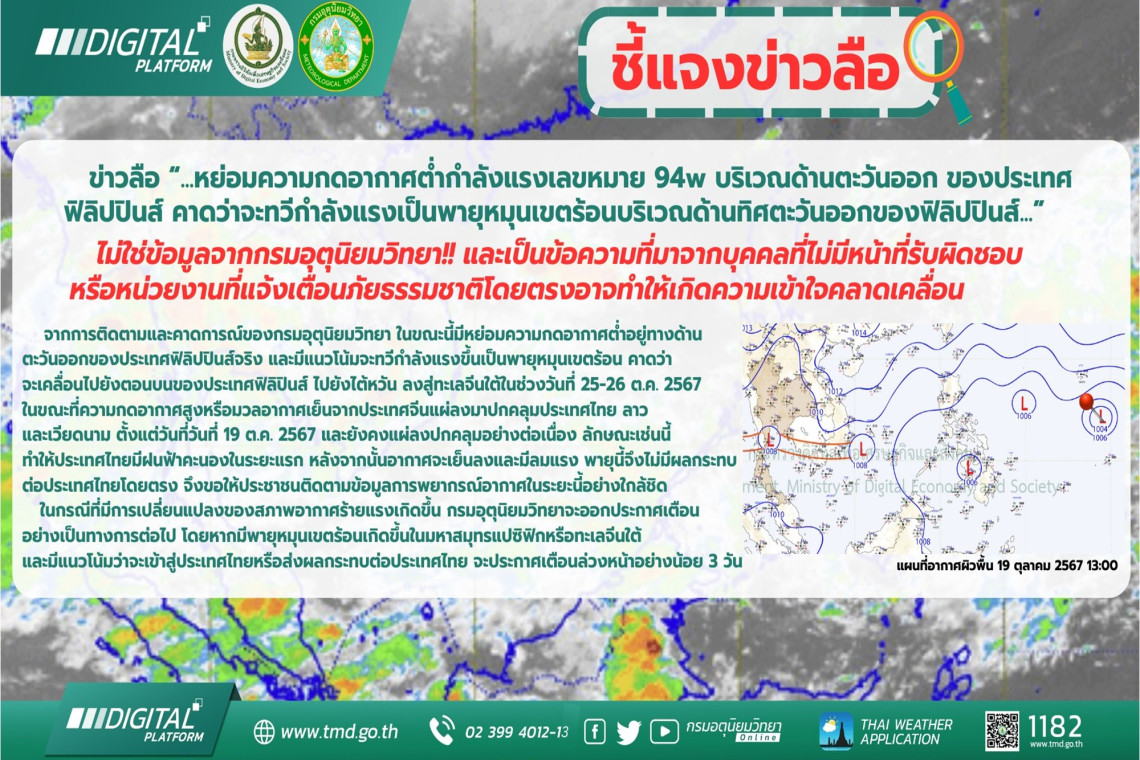 เมื่อวันที่ 20 ต.ค.67 เพจเฟซบุ๊ก "กรมอุตุนิยมวิทยา" โพสต์รูปและข้อความ ระบุว่า กรมอุตุนิยมวิทยาชี้แจงข่าวลือ “...หย่อมความกดอากาศต่ำกำลังแรงเลขหมาย 94w บริเวณด้านตะวันออก ของประเทศฟิลิปปินส์ คาดว่าจะทวีกำลังแรงเป็นพายุหมุนเขตร้อนบริเวณด้านทิศตะวันออกของฟิลิปปินส์...” ข่าวนี้ไม่ใช่ข้อมูลจากกรมอุตุนิยมวิทยา!! และเป็นข้อความที่มาจากบุคคลที่ไม่มีหน้าที่รับผิดชอบหรือหน่วยงานที่แจ้งเตือนภัยธรรมชาติโดยตรงอาจทำให้เกิดความเข้าใจคลาดเคลื่อน