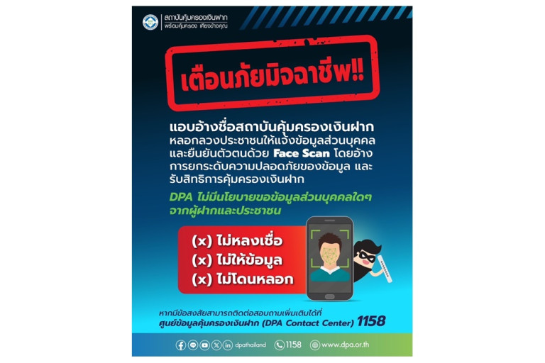 สถาบันคุ้มครองเงินฝาก (DPA) แจ้งเตือนภัยประชาชน อย่าหลงเชื่อมิจฉาชีพหลอกดูดข้อมูลส่วนบุคคลเพื่อรับสิทธิการคุ้มครองเงินฝาก