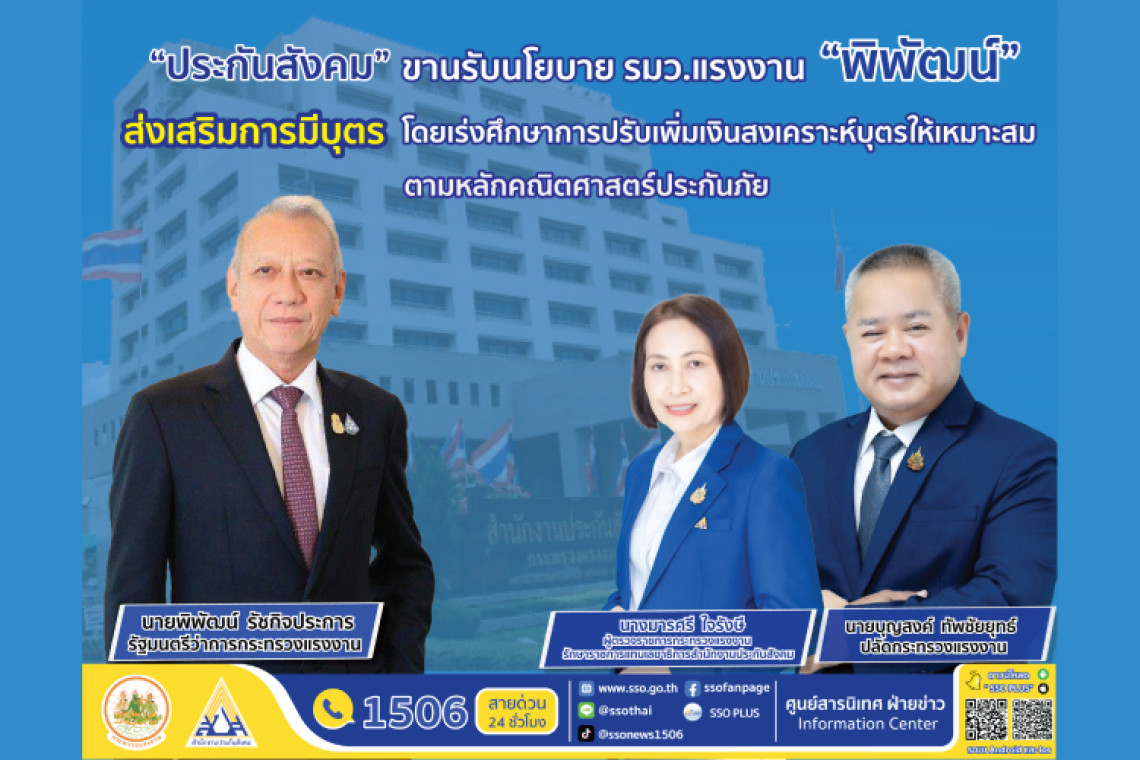 ประกันสังคมขานรับนโยบายการเพิ่มสิทธิประโยชน์กรณีสงเคราะห์บุตรเพื่อส่งเสริมการมีบุตร ตามแนวคิดของรัฐมนตรีแรงงาน พิพัฒน์ โดยเร่งศึกษาแนวทางการดำเนินงานที่เหมาะสมตามหลักคณิตศาสตร์ประกันภัย