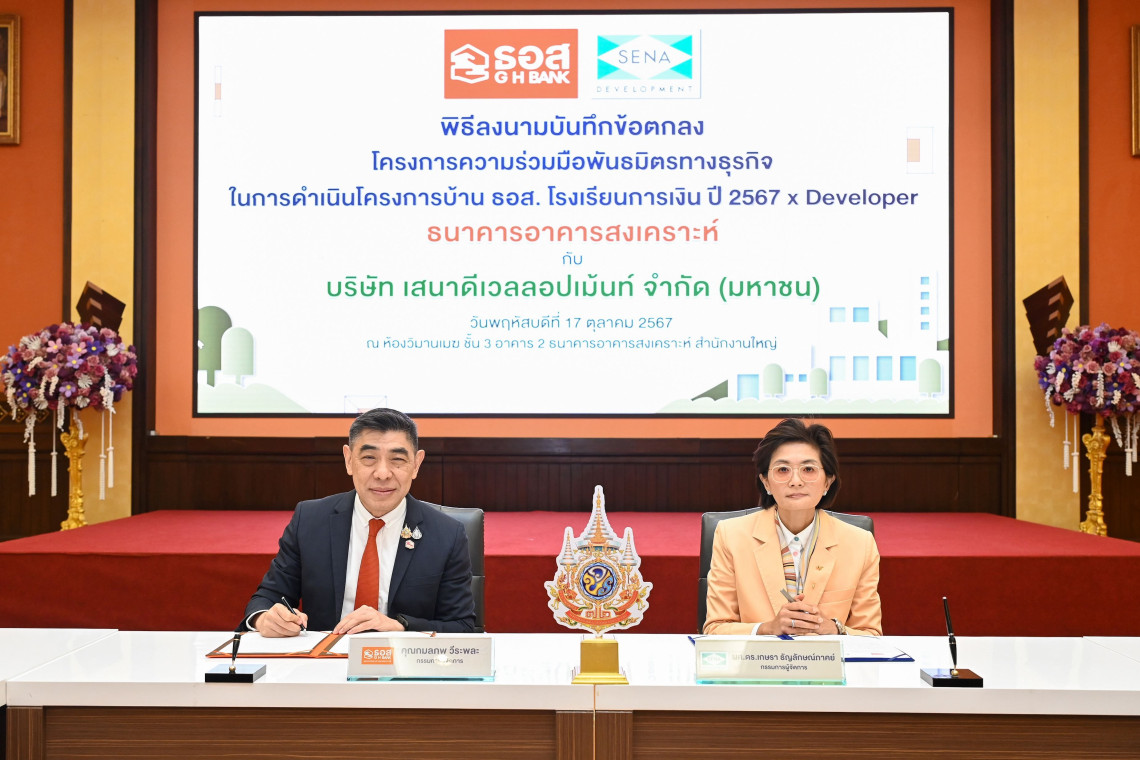 กับ บริษัท เสนาดีเวลลอปเม้นท์ จำกัด (มหาชน) โดย ผศ.ดร.เกษรา ธัญลักษณ์ภาคย์ กรรมการผู้จัดการ บริษัท เสนาดีเวลลอปเม้นท์ จำกัด (มหาชน) ลงนามบันทึกข้อตกลง (MOU) โครงการความร่วมมือพันธมิตรทางธุรกิจในการดำเนินโครงการบ้าน ธอส.โรงเรียนการเงิน ปี 2567 x Developer เพื่อให้ประชาชนทั่วไปที่ประกอบอาชีพ