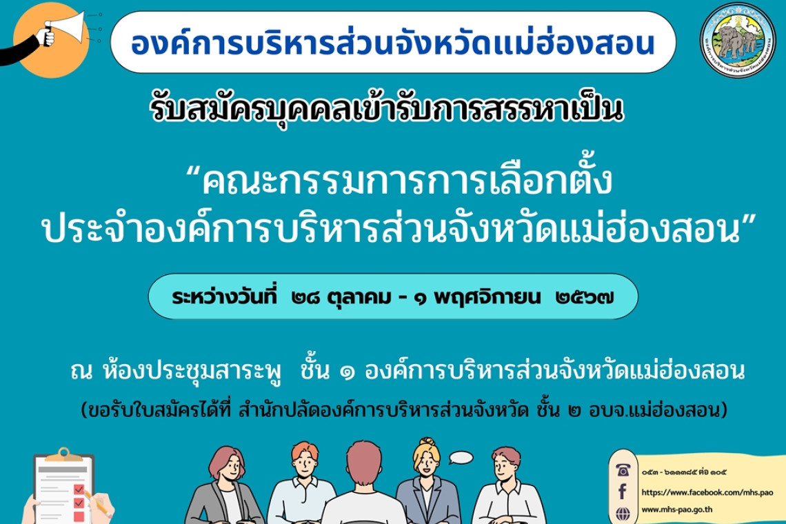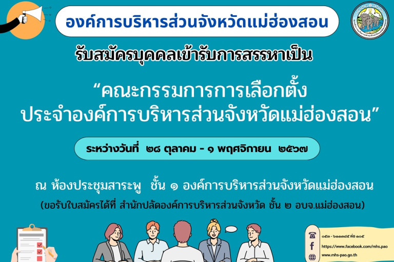 วันที่ 21 ต.ค.67 นายอัครเดช วันไชยธนวงศ์ นายกอบจ.แม่ฮ่องสอน เปิดเผยว่า ผู้อำนวยการการเลือกตั้งประจำองค์การบริหารส่วนจังหวัดแม่ฮ่องสอน ประกาศรับสมัครบุคคลเข้ารับการสรรหาเป็นคณะกรรมการการเลือกตั้งประจำองค์การบริหารส่วนจังหวัดแม่ฮ่องสอน เพื่อปฏิบัติหน้าที่ในการเลือกตั้งสมาชิกสภาองค์การบริหารส่วนจังหวัดและนายกองค์การบริหารส่วนจังหวัดแม่ฮ่องสอน  จำนวน 5 คน  โดยเปิดรับสมัครระหว่างวันที่ 28 ตุลาคม ถึงวันที่ 1 พฤศจิกายน  2567 เวลา 08.00 – 16.30 น. ณ ห้องประชุมสาระพู ชั้น 1 องค์การบริหารส่วนจังหวัดแม่ฮ่องสอน
