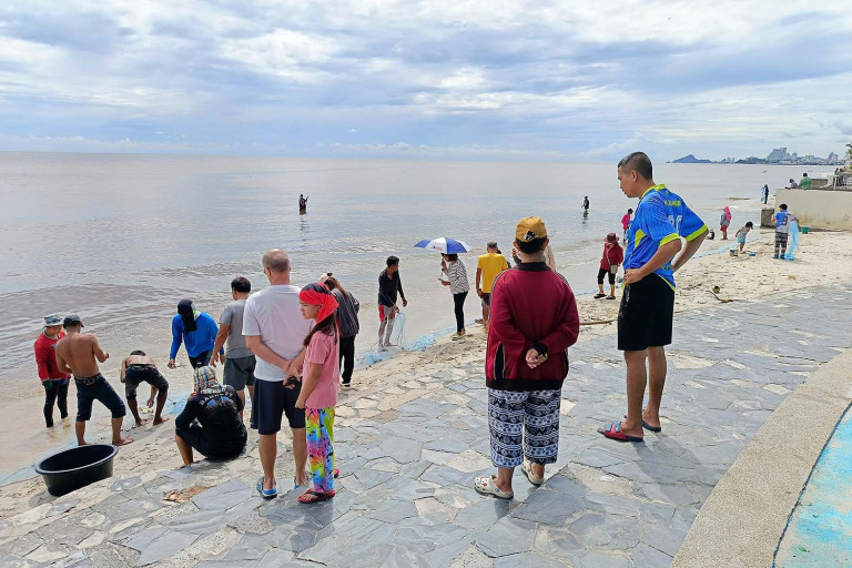 วันที่ 21 ต.ค.67 ผู้สื่อข่าวรายงานที่บริเวณชายหาดหัวหิน จ.ประจวบฯ มีประชาชนจำนวนมากต่างใช้อุปกรณ์จับสัตว์น้ำเช่น อวน แห สวิง ลงจับสัตว์ทะเลจำนวนมากที่ลอยแพขึ้นหายใจเต็มทะเลหัวหินกันอย่างต่อเนื่อง จากปรากฏการณ์ “น้ำเบียด-น้ำกัน” ตั้งแต่บริเวณสวนหลวงราชินี 19 ไร่ ตลอดแนวไปทางหมู่หมู่บ้านเขาตะเกียบ ระยะทางราว 3 กม. นอกจากนี้ยังมีชาวประมงต่างนำเรือประมงขนาดเล็กแล่นออกไปในทะเลบริเวณชายฝั่งนำอวนตาข่ายลงไปลากปลาเข้าฝั่ง ได้มาตั้งแต่ 50-100 กิโลกรัม โดยชาวบ้านแต่ละรายสามารถจับปูและปลามีทั้ง ปลาเก๋า ปลาลิ้นหมา ปลาทราย และฉลามหิน นำกลับไปประกอบอาหารที่บ้าน ส่วนปลาที่มีขนาดใหญ่หน่อยก็นำไปขาย โดยมีนักท่องเที่ยวทั้งชาวไทยและต่างชาติยืนถ่ายภาพแชร์ในสังคมโซเชียลด้วยความสนใจ และหากในช่วงเย็นน้ำทะเลลดลงจะมีชาวบ้านลงจับปลามากกว่านี้