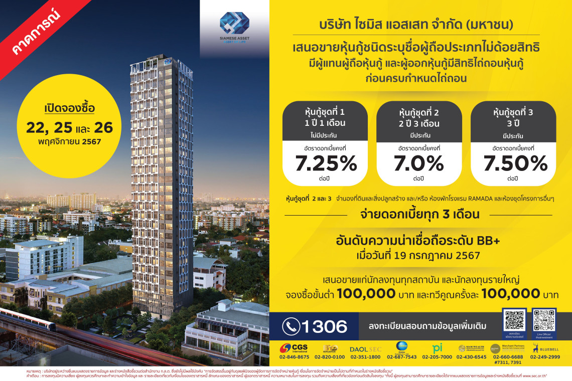 SA เตรียมเสนอขายหุ้นกู้จำนวน 3 ชุด แบบมีประกันและไม่มีประกัน อายุระหว่าง 1 ปี 1 เดือน – 3 ปี อัตราดอกเบี้ย 7.00% ถึง 7.50% ต่อปี โดยจ่ายดอกเบี้ยทุกๆ 3 เดือน คาดเปิดจองซื้อระหว่างวันที่ 22, 25 - 26 พฤศจิกายน 2567 ฟากซีเอฟโอ “รีย์ฐิตา อักษรจิรารัตน์” ระบุ สำหรับชุดที่มีประกันจะมีสินทรัพย์ค้ำประกันมูลค่ากว่า 130% ของวงเงินที่ออก ส่วนผลตอบแทนสูงอ้างอิงจาก MLR (Minimum Loan Rate) เป็นอัตราดอกเบี้ยชั้นดีของลูกค้ารายใหญ่ของธนาคาร สะท้อนประสิทธิภาพในการบริหารสภาพคล่องทางการเงินที่แข็งแกร่ง ย้ำ! หุ้นกู้ทุกชุดจ่ายครบตามกำหนดเวลา ยืนยันไม่เคยมีประวัติการผิดนัดชำระคืนหุ้นกู้ ส่วนแนวโน้มผลงานปีนี้เติบโตโดดเด่นกว่า 2 เท่าตัว จากยอดโอนโครงการใหญ่ Landmark @ MRTA Station