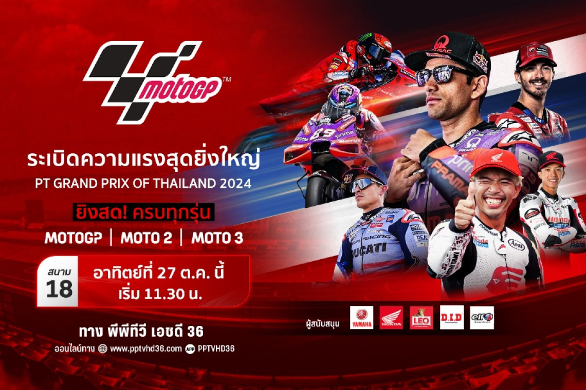 นับถอยหลังสู่กรังด์ปรีซ์ที่ใหญ่ที่สุดของประเทศไทย กับศึกโมโตจีพี รายการ “พีที กรังด์ปรีซ์ ออฟ ไทยแลนด์ 2024” (PT Grand Prix of Thailand 2024) โดยประเทศไทยเป็นเจ้าภาพ สนามที่ 18 ณ จังหวัดบุรีรัมย์ และเป็นประจำทุกปี พีพีทีวี เอชดี ช่อง 36 จะถ่ายทอดสดแบบครบทุกรุ่น เพื่อให้แฟนมอเตอร์สปอร์ตได้มันส์เต็มพิกัด ในวันอาทิตย์ที่ 27 ต.ค. นี้ ตั้งแต่เวลา 11.30 น. เป็นต้นไป