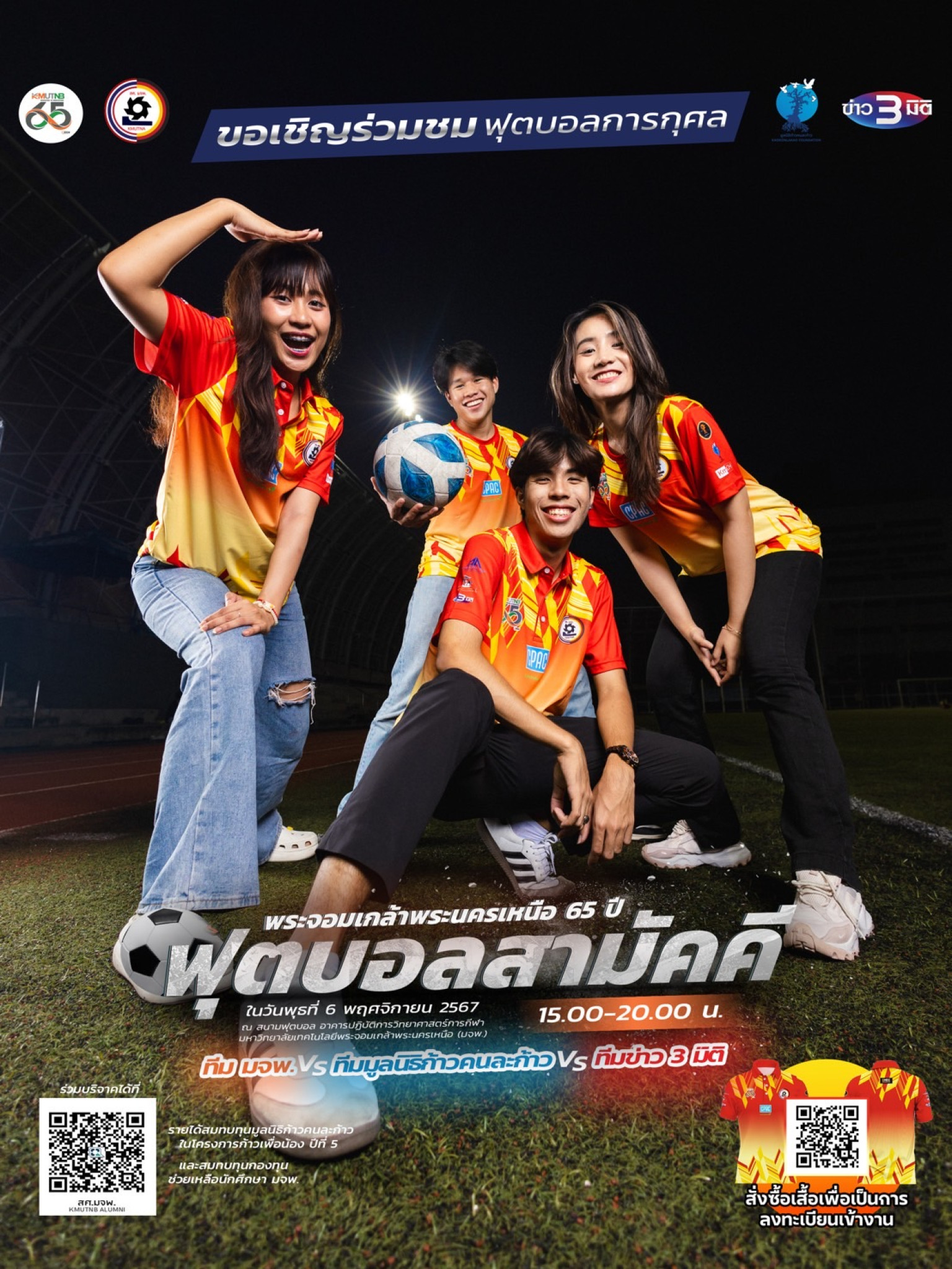 มหาวิทยาลัยเทคโนโลยีพระจอมเกล้าพระนครเหนือ (มจพ.) ร่วมกับสมาคมศิษย์เก่าฯ ในพระบรมราชูปถัมภ์ จัดการแข่งขันฟุตบอลการกุศล “พระจอมเกล้าพระนครเหนือ 65 ปี ฟุตบอลสามัคคี ทีม มจพ. ทีมข่าว 3 มิติ และทีมมูลนิธิก้าวคนละก้าว เพื่อสมทบทุนมูลนิธิก้าวคนละก้าวในโครงการก้าวเพื่อน้องปีที่ 5 และสมทบทุนการศึกษาให้กับกองทุนช่วยเหลือนักศึกษา มจพ.” เนื่องในโอกาสครบรอบ 65 ปี แห่งการก่อตั้งมหาวิทยาลัย วัตถุประสงค์เพื่อจัดหารายได้สมทบทุนให้กับมูลนิธิก้าวคนละก้าว ในโครงการก้าวเพื่อน้องปีที่ 5 นำไปสนับสนุนทุนการศึกษาแก่นักเรียนที่ขาดแคลนทุนทรัพย์หรือด้อยโอกาสให้ได้รับการศึกษาต่อ และเพื่อสมทบทุนเข้ากองทุนช่วยเหลือนักศึกษา มจพ. และเพื่อสานสัมพันธ์อันดีร่วมกันเพื่อช่วยเหลือสังคมระหว่าง ทีมมูลนิธิก้าวคนละก้าว ทีมข่าว 3 มิติ และมหาวิทยาลัยเทคโนโลยีพระจอมเกล้าพระนครเหนือ โดยใช้กีฬาเป็นสื่อกลาง จัดแข่งขันในวันพุธที่ 6 พฤศจิกายน 2567 ตั้งแต่เวลา 15.00 น. ณ สนามฟุตบอลอาคารปฏิบัติการวิทยาศาสตร์การกีฬา มจพ.