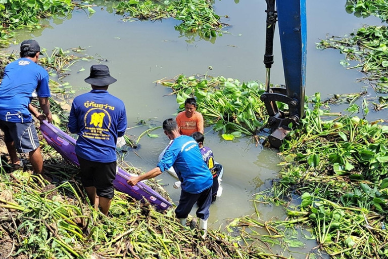 จนเมื่อช่าวเวลา 10.30 น.วันที่ 29 ต.ค.67 ทางพ.ต.ท.สมบัติ ครุฑธา รอง ผกก.สอบสวน สภ.เขาดินได้รับแจ้ง ว่ามีช่างขับรถแบ็กโฮของ อบจ.ราชบุรี ที่ทาง นายมงคล นาคเนียม นายกเทศบาลเขาขวางทำเรื่องขอรถแบ็กโฮมาทำการลากผักตบขึ้นจากคลองบางสองร้อย และค้นหาร่างผู้สูญหาย ซึ่งคนขับรถได้พบศพลอยอยู่ในคลองเต็มไปด้วยผักตบชวา ที่บริเวณสะพานคลองบางสองร้อยในเขตพื้นที่ ม.3 ต.นางแก้ว เขต สภ.เขาดิน และเขตม.1ต.บางโตนด เขตพื้นที่ สภ.โพธาราม หลังรับแจ้งจึงรายงานให้ พ.ต.ท.อภิมุข คุณาภรณ์ รอง ผกก.ป.สภ.เขาดิน รักษาราชการ ผกก.สภ.เขาดิน พร้อมรายงานไปยัง พ.ต.อ.ชัชชน นราวุฒิพร ผกก.สภ.โพธาราม เนื่องจากเป็นเขตรอยต่อกัน พร้อมประสานแพทย์โรงพยาบาลโพธาราม เจ้าหน้าที่พิสูจน์หลักฐาน ชุดสืบสวนจังหวัดราชบุรี ชุดสืบสวนสภ.เขาดิน เจ้าหน้าที่กู้ภัย ลงพื้นที่ตรวจสอบ