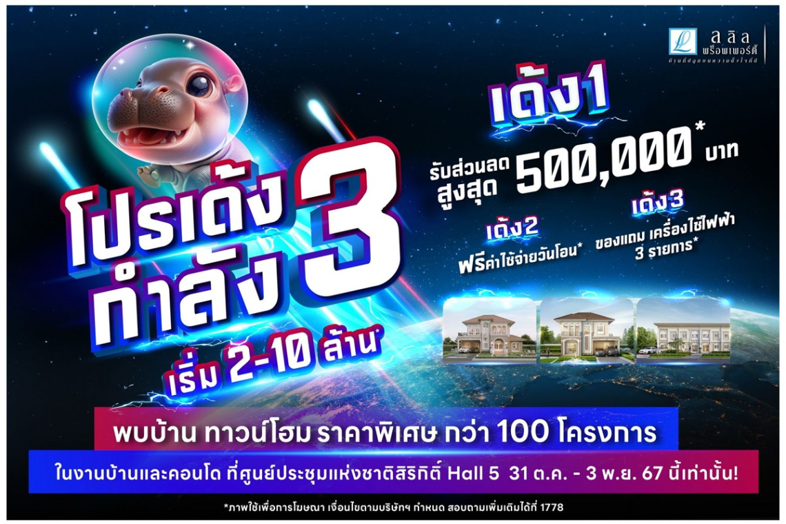 ลลิล พร็อพเพอร์ตี้ หนุนคนซื้อบ้าน อัดโปรพิเศษ! 'เด้งกำลัง 3' มอบส่วนลดและของแถมรวมเฉียดล้าน กระตุ้นผู้บริโภครีบตัดสินใจก่อนสิ้นสุดมาตรการส่งเสริมจากภาครัฐในปี 67
