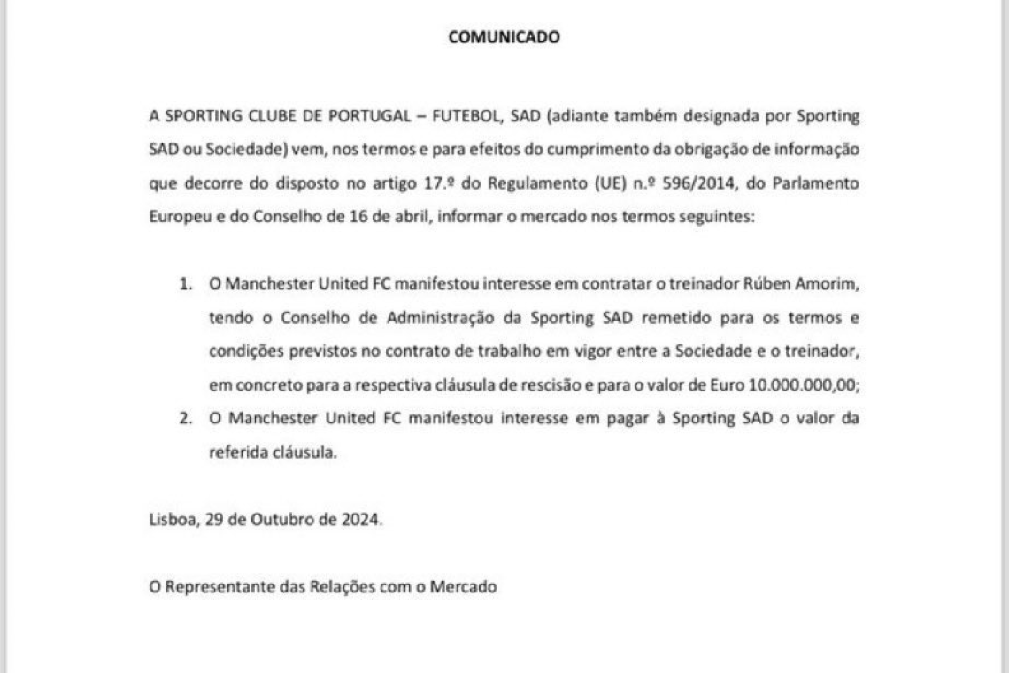 แถลงการณ์จากสโมสร ระบุว่า "1.แมนฯ ยูไนเต็ด แสดงความสนใจในตัวของ รูเบน อโมริม และบอร์ดบริหารของ สปอร์ติ้ง ได้แจ้งเงื่อนไขในสัญญาว่าระหว่างสโมสรและโค้ชว่ามีค่ายกเลิกเป็นจำนวน 10 ล้านยูโร (8.3 ล้านปอนด์)"