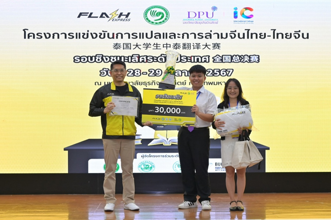 บริษัท แฟลช เอ็กซ์เพรส จำกัด ผู้นำด้านธุรกิจขนส่งและโลจิสติกส์ระดับมืออาชีพ ให้บริการครบวงจร ครอบคลุมทั่วไทย และเซาท์ อีส เอเชีย ขอแสดงความยินดีกับนิสิต นักศึกษาทุกคนที่ได้รับรางวัลชนะเลิศการแข่งขันทักษะการแปลและการล่ามจีนไทย – ไทยจีน ระดับประเทศ ปีที่ 1 จำนวน 10 รางวัลพร้อมรับทุนการศึกษา และเกียรติบัตร สำหรับโครงการดังกล่าวเกิดขึ้นจากความร่วมมือระหว่างแฟลช เอ็กซ์เพรส และสถาบันขงจื่อเส้นทางสายไหมทางทะเล มหาวิทยาลัยธุรกิจบัณฑิตย์ โดยในปีนี้มีนิสิต นักศึกษา จากมหาวิทยาลัยชั้นนำทั่วประเทศสมัครเข้าร่วมการแข่งขันมากกว่า 30 มหาวิทยาลัย และมีนิสิต นักศึกษามากว่า 300 คนเข้าร่วมการแข่งขันทั้งในระดับภูมิภาค และระดับประเทศ