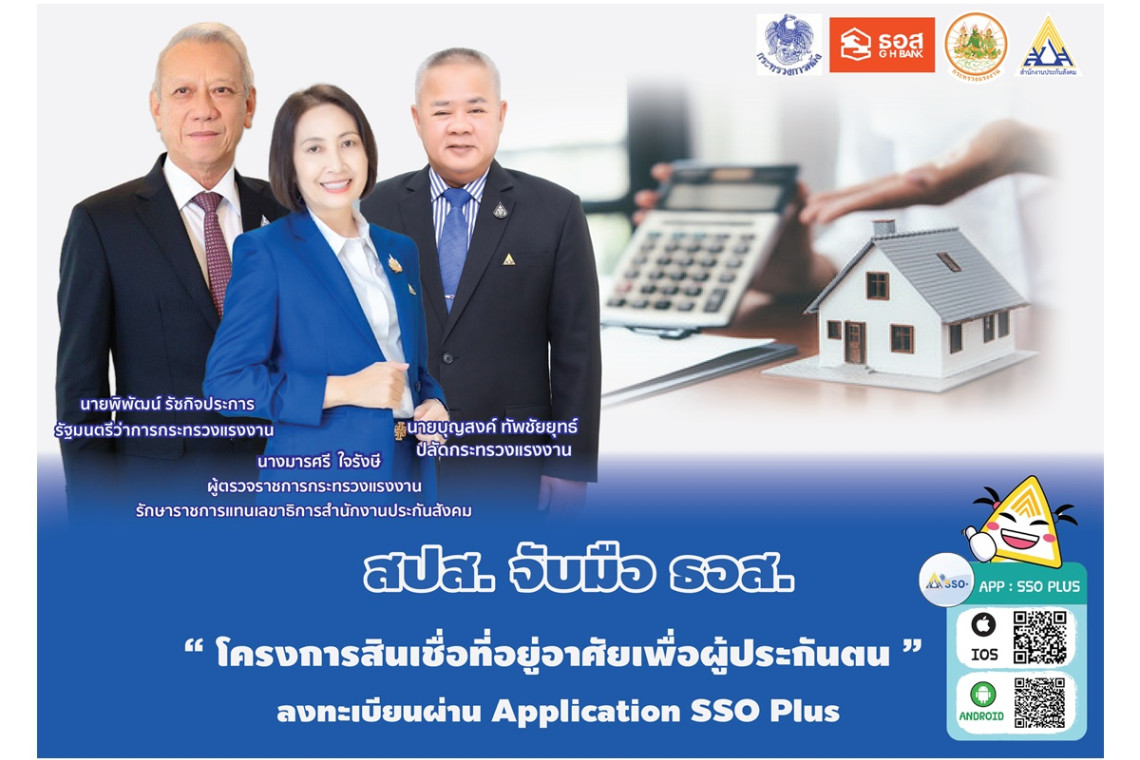 เมื่อวันที่ 31 ตุลาคม 2567 นางมารศรี ใจรังษี ผู้ตรวจราชการกระทรวงแรงงาน รักษาราชการแทนเลขาธิการสำนักงานประกันสังคม เปิดเผยว่า ตามที่รัฐบาลและกระทรวงแรงงาน มีนโยบายให้ความสำคัญกับการเสริมสร้างหลักประกันความมั่นคงให้แก่ผู้ใช้แรงงาน เพื่อยกระดับคุณภาพชีวิตความเป็นอยู่ให้ดียิ่งขึ้น โดยนายพิพัฒน์ รัชกิจประการ รัฐมนตรีว่าการกระทรวงแรงงาน ได้เร่งผลักดันนโยบายให้สำนักงานประกันสังคม กระทรวงแรงงาน จับมือกับธนาคารอาคารสงเคราะห์ กระทรวงการคลัง จัดโครงการสินเชื่อที่อยู่อาศัยเพื่อผู้ประกันตน ปี 2567 เพื่อเป้าหมาย “ทำให้คนไทยมีบ้าน” โดยจะช่วยให้ผู้ประกันตนทุกคนมีที่อยู่อาศัยเป็นของตนเองได้ในอัตราดอกเบี้ยต่ำ นั้น