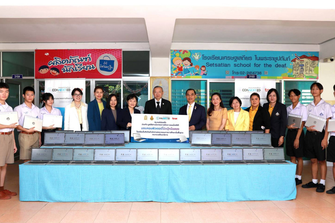 กระทรวงศึกษาธิการ รับมอบคอมพิวเตอร์โน้ตบุ๊กสภาพดีพร้อมใช้งาน จำนวน 46 เครื่อง ซึ่งบมจ. ทรู คอร์ปอเรชั่น และมูลนิธิสานอนาคตการศึกษา คอนเน็กซ์อีดี มอบให้แก่โรงเรียนเศรษฐเสถียร ในพระราชูปถัมภ์ หนึ่งในสถาบันการศึกษาที่เปิดการเรียนการสอนให้แก่กลุ่มนักเรียนที่มีความบกพร่องทางการได้ยิน ซึ่งในโอกาสนี้ ดร.เนตรชนก วิภาตะศิลปิน หัวหน้าสายงานกลยุทธ์องค์กรและด้านการศึกษา บมจ. ทรู คอร์ปอเรชั่น / กรรมการและเลขานุการ มูลนิธิสานอนาคตการศึกษา คอนเน็กซ์อีดี ได้เป็นตัวแทนส่งมอบคอมพิวเตอร์โน้ตบุ๊กดังกล่าว โดยมี ว่าที่ร้อยตรี ธนุ วงษ์จินดา เลขาธิการ คณะกรรมการการศึกษาขั้นพื้นฐาน นางภัทริยาวรรณ พันธุ์น้อย ผู้อำนวยการสำนักบริหารงานการศึกษาพิเศษ ดร.ปนัดดา วงค์จันตา ผู้อำนวยการโรงเรียนเศรษฐเสถียร ในพระราชูปถัมภ์ พร้อมด้วยคณะครูและนักเรียน ร่วมเป็นสักขีพยาน ทั้งนี้ บมจ. ทรู คอร์ปอเรชั่น และมูลนิธิสานอนาคตการศึกษา คอนเน็กซ์อีดี ยังจะมีแผนที่จะส่งมอบคอมพิวเตอร์โน้ตบุ๊กมือสองเพิ่มเติมอีก 100 เครื่อง ให้แก่สำนักงานคณะกรรมการการศึกษาขั้นพื้นฐานได้นำไปจัดสรรให้แก่โรงเรียนในสังกัดสพฐ.ที่ขาดแคลนทั่วประเทศ เพื่อให้นักเรียนได้เข้าถึงแหล่งข้อมูล นำความรู้จากการใช้เทคโนโลยีมาประยุกต์ใช้ให้เกิดประโยชน์สูงสุด ตลอดจนส่งเสริมให้มีทักษะรักการเรียนรู้ตลอดชีวิต