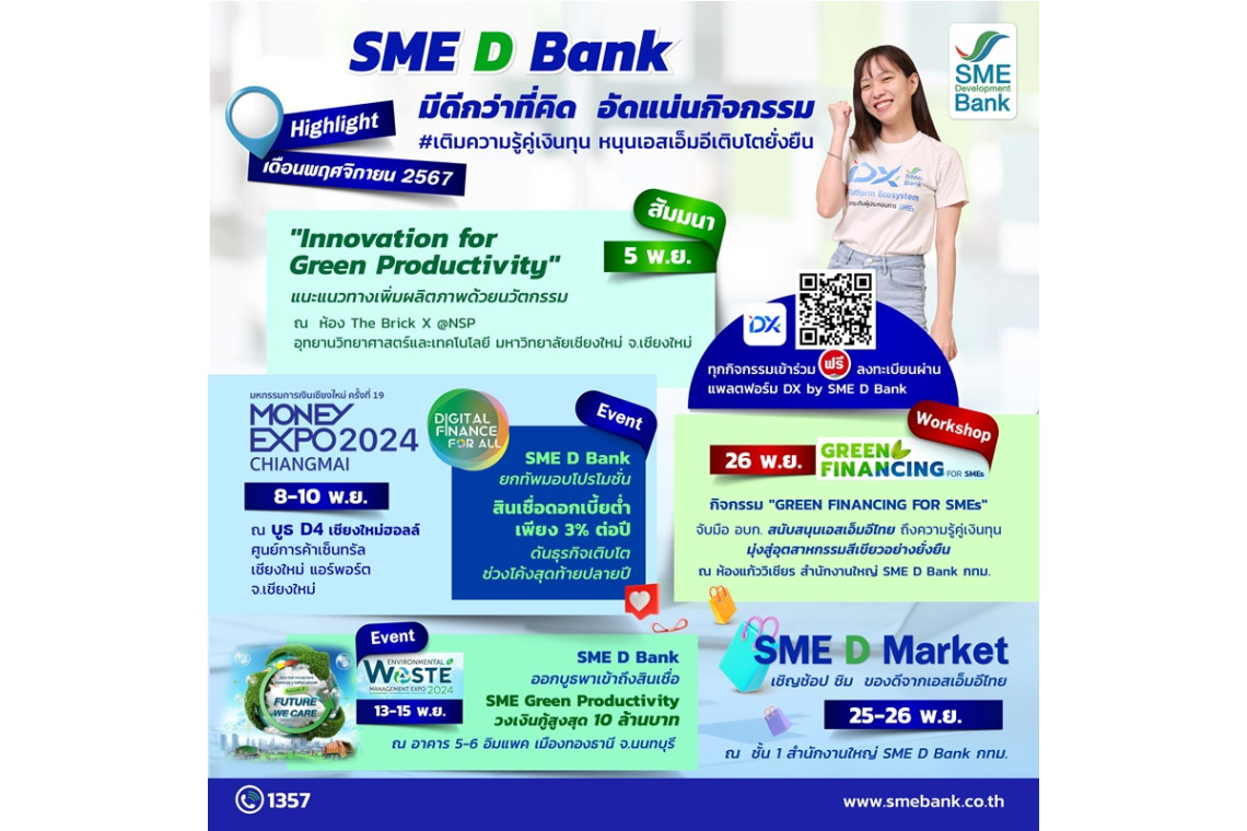 ธนาคารพัฒนาวิสาหกิจขนาดกลางและขนาดย่อมแห่งประเทศไทย (ธพว.) หรือ SME D Bank เดินหน้าพาผู้ประกอบการเอสเอ็มอีเติบโตอย่างเข้มแข็งและยั่งยืน ยกขบวนโปรแกรมพัฒนาอัดแน่นตลอดเดือนพฤศจิกายน 2567 มุ่งเน้นยกระดับธุรกิจเป็นมิตรต่อสิ่งแวดล้อม และดันต่อยอดถึงแหล่งทุน สินเชื่อ “SME Green Productivity” ดอกเบี้ยต่ำ 3% ต่อปี คงที่ตลอด 3 ปีแรก วงเงินกู้สูงสุดถึง 10 ล้านบาท ผ่อนนานสูงสุด 10 ปี ปลอดชำระหนี้เงินต้น 12 เดือนแรก มีหรือไม่มีหลักทรัพย์ค้ำประกันก็กู้ได้ ทุกกิจกรรมสมัครเข้าร่วมได้ฟรี ลงทะเบียนผ่านแพลตฟอร์ม DX by SME D Bank (https://dx.smebank.co.th/) สอบถามข้อมูลเพิ่มเติม Call Center 1357