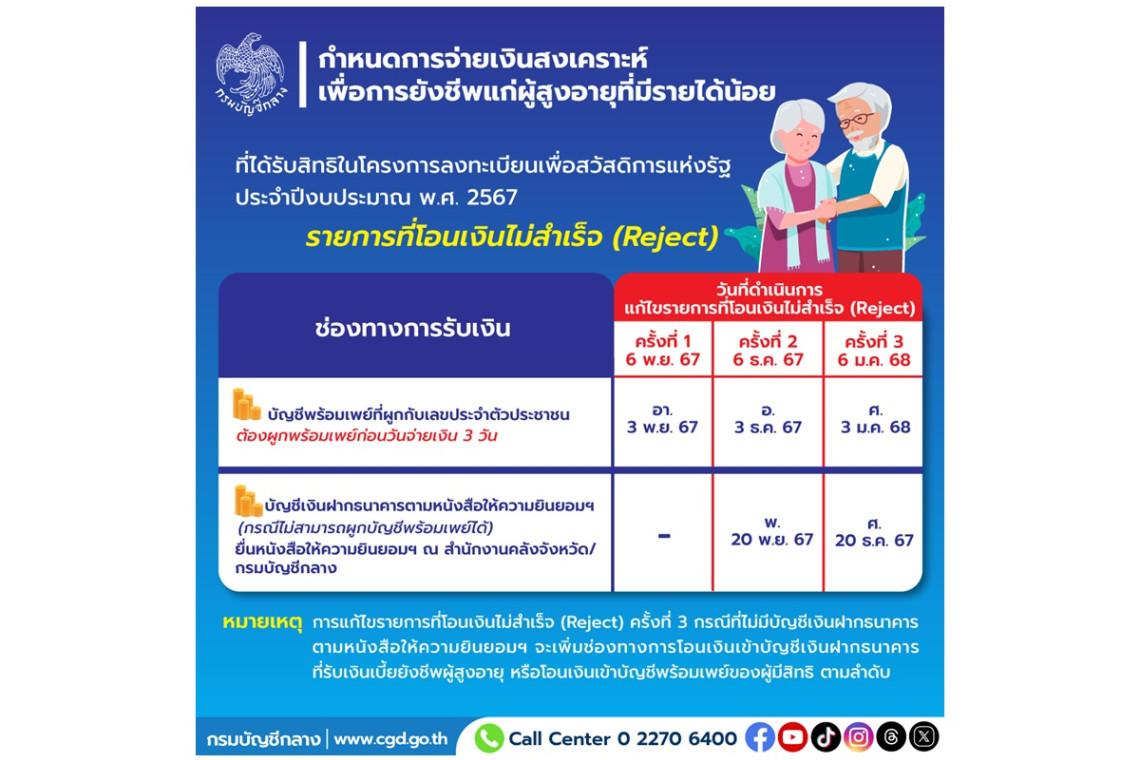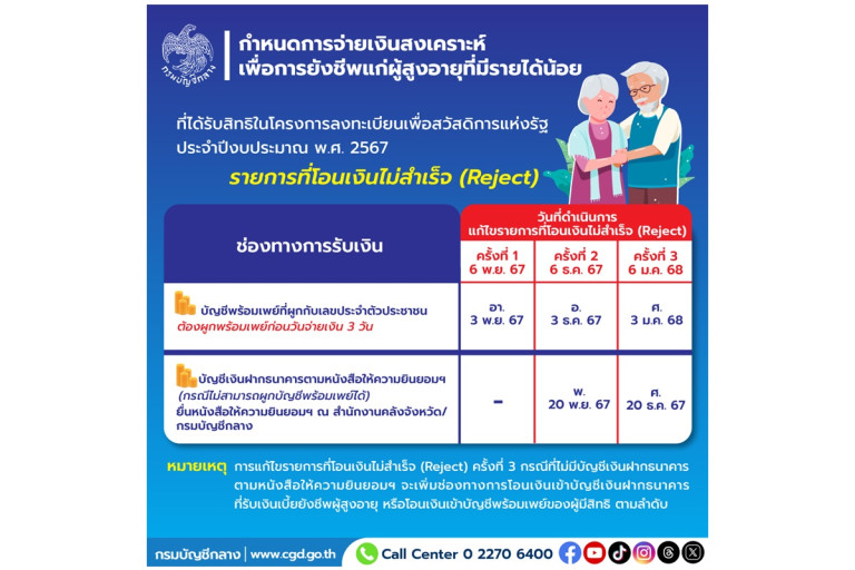 ทั้งนี้มติที่ประชุมคณะกรรมการบริหารกองทุนผู้สูงอายุ เมื่อวันพุธที่ 30 ตุลาคม 2567 ได้อนุมัติแนวทางการโอนเงินสงเคราะห์เพื่อการยังชีพแก่ผู้สูงอายุที่มีรายได้น้อยที่ได้รับสิทธิในโครงการลงทะเบียนเพื่อสวัสดิการแห่งรัฐ ประจำปีงบประมาณ พ.ศ.2567 รายการที่โอนเงินไม่สำเร็จ (Reject) และให้ทำการแก้ไขรายการที่โอนเงินไม่สำเร็จ (Reject) จำนวน 3 ครั้ง ดังนี้