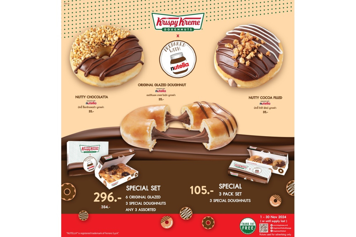 คริสปี้ ครีม (Krispy Kreme) โดนัทสูตรลิขสิทธิ์อันดับ 1 ที่ครองใจคนทั่วโลก ชวนคุณมาสัมผัสประสบการณ์ใหม่ ด้วยคอลเล็กชัน Krispy Kreme x prepared with nutella นำรสชาติความอร่อยระดับตำนานแบบฉบับของนูเทลล่ามารังสรรค์ เป็น 3 หน้าสุดพิเศษ เริ่มด้วย “ออริจินอล เกลซ โดนัท นูเทลล่า” (Original Glazed Doughnut prepared with nutella) เมนูยอดฮิตอย่างออริจินอล เกลซ สอดไส้นูเทลล่าเข้มเต็มวง, “นัทตี้ ช็อกโกแลตต้า นูเทลล่า” (Nutty Chocolatta prepared with nutella) โดนัทเคลือบนูเทลล่าเน้นๆ พร้อมโรยพีนัท ครัช เพิ่มความกรุบกรอบ, “นัทตี้ โกโก้ ฟิลด์ นูเทลล่า” (Nutty Cocoa Filled prepared with nutella) โดนัทเนื้อนุ่มสอดไส้นูเทลล่าครีม ท็อปด้วยนูเทลล่า-ไวท์ช็อกโกแลต และพราลีน แคชชูว เพิ่มความอร่อยในทุกคำ