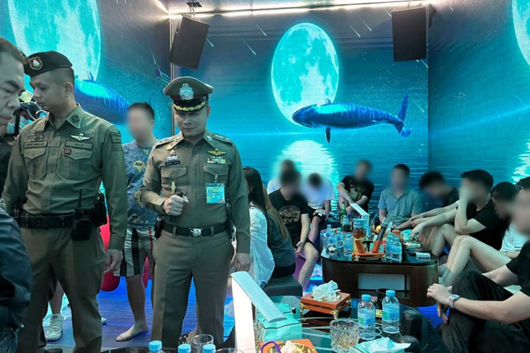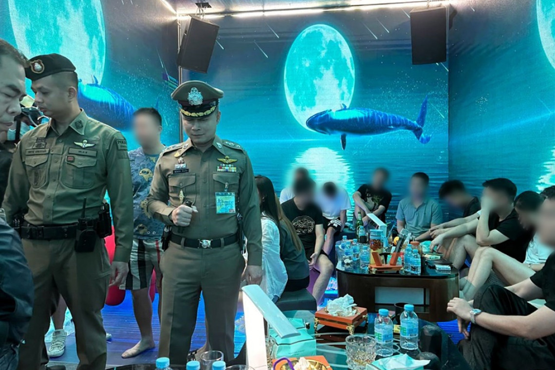 สืบเนื่องจากตำรวจ สน.ห้วยขวาง รับแจ้งข้อมูลเกี่ยวกับการลักลอบเปิดสถานบริการจึงประสานตำรวจ กก.ดส. เข้าร่วมตรวจสอบอาคารดังกล่าว โดยพบว่าบริเวณ ชั้น 1 และ 2 ยังคงปรับปรุงก่อสร้าง และตกแต่ง เมื่อมาถึงบริเวณชั้น 3 พบห้องที่ตกแต่งแล้วจำนวน 2 ห้อง ระบบ แสง สี เสียง และพบผู้ใช้บริการชาวจีน รวม 26 ราย โดยห้องที่ 1 จำนวน 7 คน (ชาย 3 คน หญิง 4) และห้องที่ 2 จำนวน 19 คน (ชาย 13 คน หญิง 6) ทั้ง 2 ห้อง อยู่ระหว่างดื่มกิน และรับทานอาหาร จากการตรวจค้นภายในห้องที่ 1 พบอุปกรณ์เสพยาเสพติด และบริเวณหน้าห้องที่ 2 พบกระเป๋าสะพาย ซึ่งภายในพบยาเสพติดเป็นเกล็ดลักษณะคล้ายไอซ์ บรรจุในซองซิบล็อก 4 ถุง ตำรวจจึงได้จับกุมตัวนายสาคร ซึ่งแสดงตัวเป็นผู้ดูแล และเป็นผู้จัดการอาคาร