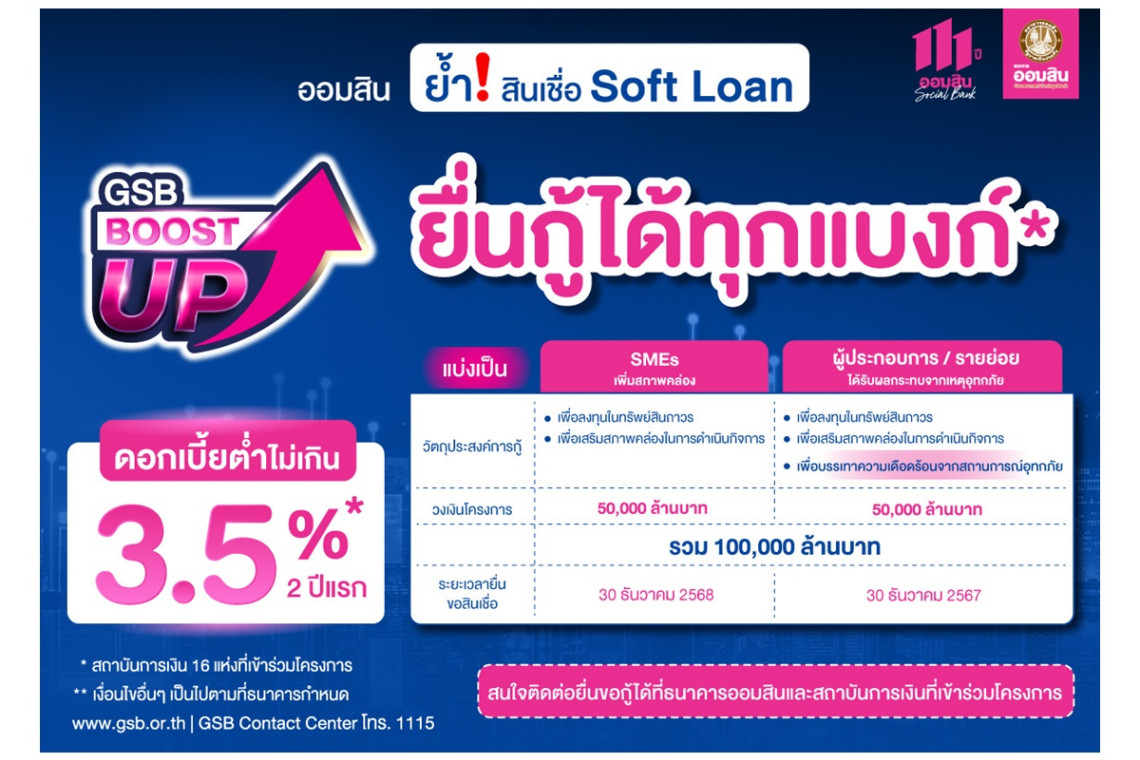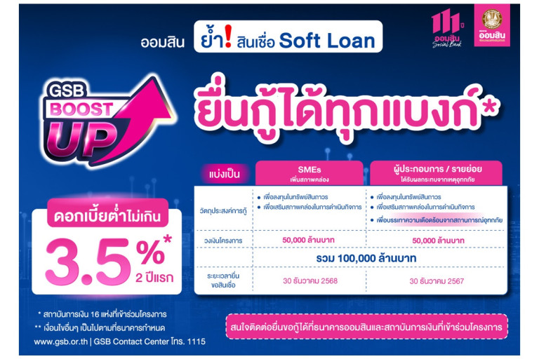 ออมสินย้ำสินเชื่อดอกเบี้ยต่ำ 3.5% สำหรับ SMEs และรายย่อย ยื่นกู้ได้ทุกแบงก์ในโครงการ Soft Loan GSB Boost Up เพื่อการลงทุน และบรรเทาความเดือดร้อนจากเหตุอุทกภัย