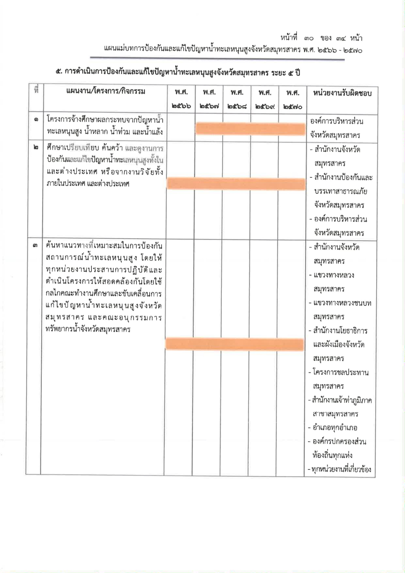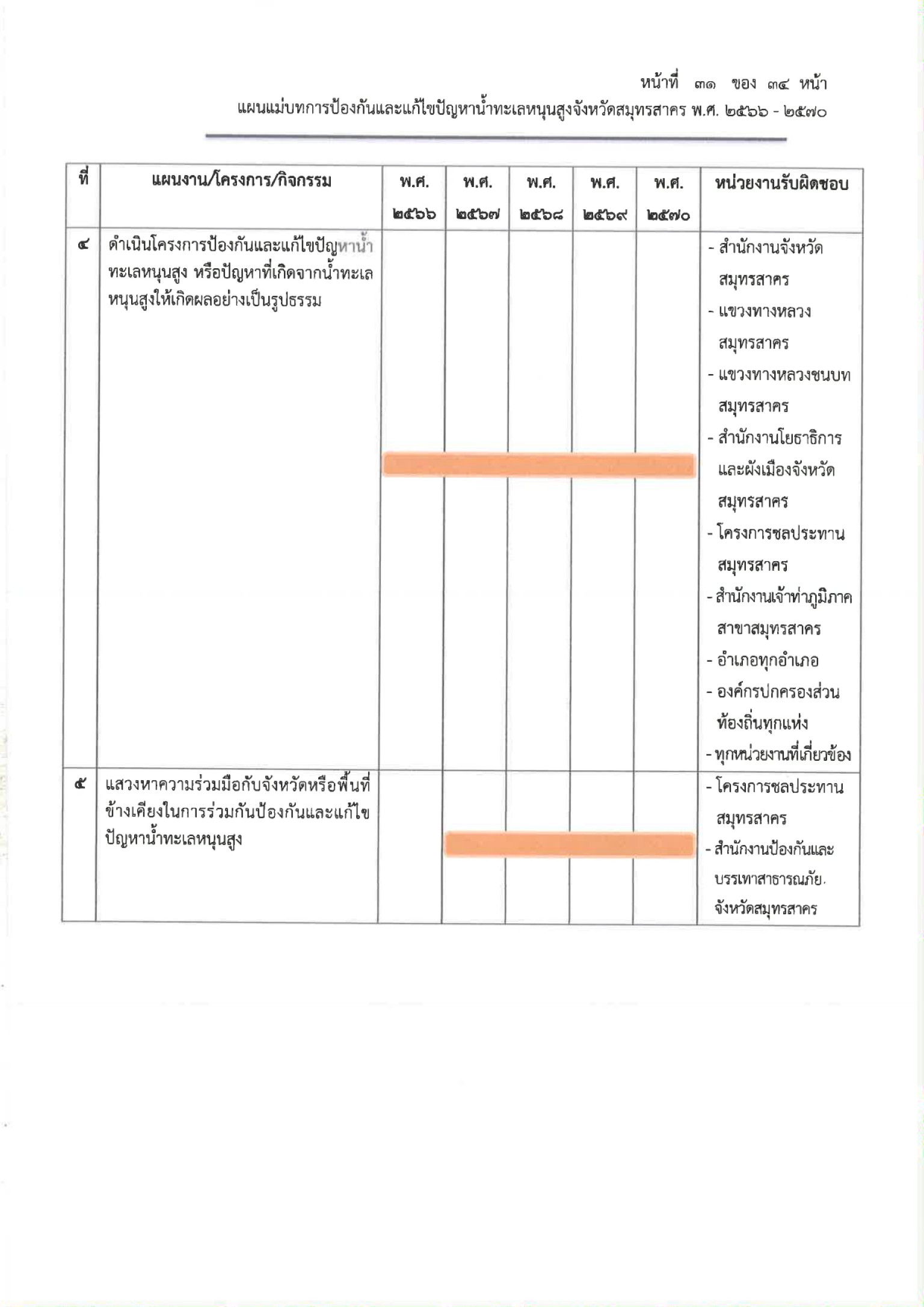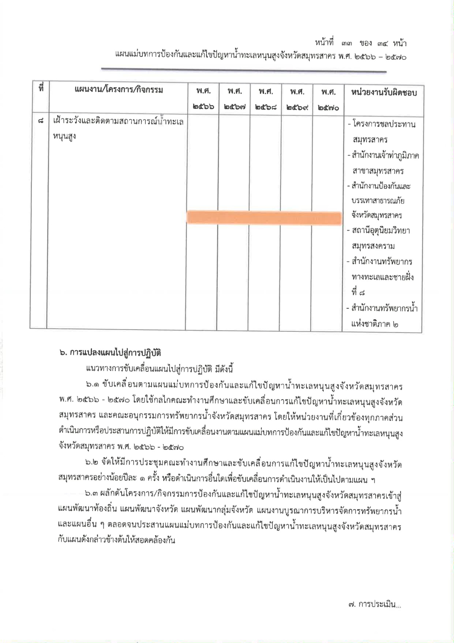 ขับเคลื่อนการแก้ไขปัญหาน้ำทะเลหนุนสูงของจังหวัดฯ ซึ่งปรากฏว่า ขณะนี้ได้มีการแต่งตั้งขึ้นไว้ก่อนหน้านี้แล้ว โดยสำหรับเนื้อหาหลักของแผนงานจะมีการศึกษาผลกระทบจากปัญหาน้ำทะเลหนุนสูง รวมทั้งเมื่อเกิดน้ำหลาก น้ำท่วม และน้ำแล้งด้วย ประกอบกับการแสวงหาแนวทางในการป้องกันแก้ไขปัญหาดังกล่าวให้มีหน่วยงานที่เกี่ยวข้องนำไปใช้ปฏิบัติ นอกจากนี้และแสวงความร่วมมือกับจังหวัดอื่นๆ และพื้นที่ใกล้เคียงสมุทรสาคร เพื่อการร่วมกันแก้ไขปัญหาหรือสาธารณภัย อันเป็นสาเหตุมาจากน้ำทะเลหนุนสูง รวมถึงสภาวะการรุกล้ำของน้ำเค็มเข้าไปที่น้ำจืดที่ใช้การเกษตรในจังหวัดสมุทรสาคร
