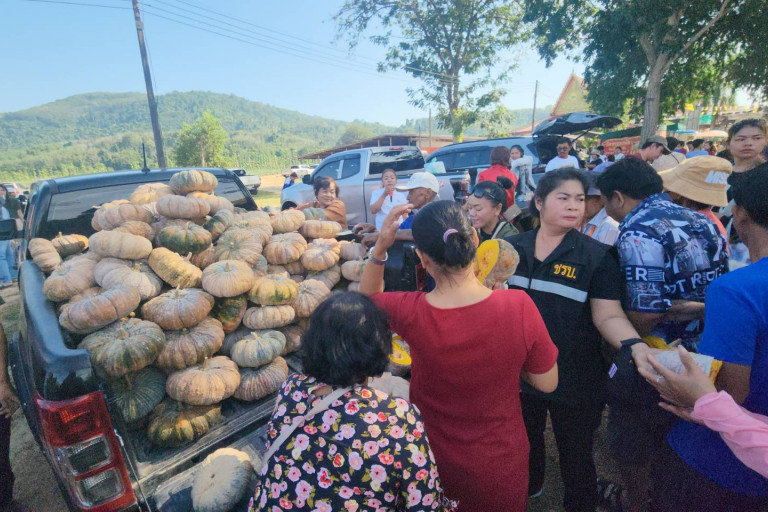 ฮือฮา! เจ้าของสวนยางปลูกฟักทองแซมร่องต้นยางขายได้เกินเป้ากว่า 30 ตัน นำมาแจกชาวบ้านร่วมทำบุญงานทอดกฐินสามัคคีวัดหนองฆ้อ ต.หนองบัว อ.บ้านค่าย จ.ระยอง ขณะยอดเงินกฐินได้กว่า 4 ล้านถวายวัด