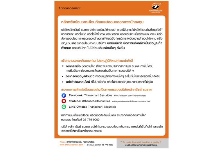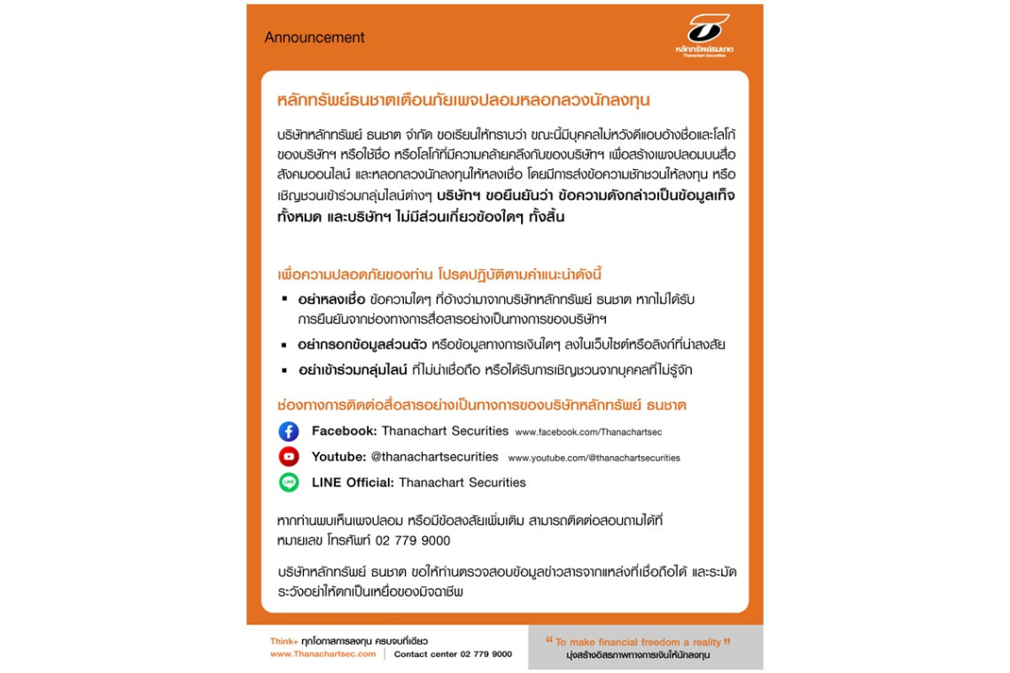 บริษัทหลักทรัพย์ ธนชาต จำกัด ขอเรียนให้ทราบว่า ขณะนี้มีบุคคลไม่หวังดีแอบอ้างชื่อ และโลโก้ของบริษัทฯ หรือใช้ชื่อ หรือโลโก้ที่มีความคล้ายคลึงกับของบริษัทฯ เพื่อสร้างเพจปลอมบนสื่อสังคมออนไลน์ และหลอกลวงนักลงทุนให้หลงเชื่อ โดยมีการส่งข้อความชักชวนให้ลงทุน หรือเชิญชวนเข้าร่วมกลุ่มไลน์ต่างๆ บริษัทฯ ขอยืนยันว่า ข้อความดังกล่าวเป็นข้อมูลเท็จทั้งหมด และบริษัทฯไม่มีส่วนเกี่ยวข้องใดๆทั้งสิ้น เพื่อความปลอดภัยของท่าน โปรดปฏิบัติตามคำแนะนำดังนี้
