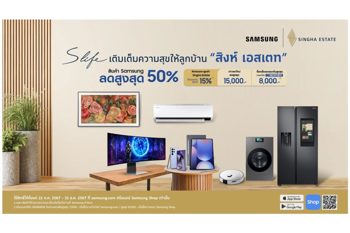 สัมผัสความสุขแห่งการใช้ชีวิตจากสิงห์ เอสเตท กับแคมเปญ “S Life เติมเต็มความสุขให้ลูกบ้านสิงห์ เอสเตท”ด้วยโปรโมชันพิเศษจากซัมซุงถึง 3 ต่อ รับส่วนลดรวมสูงสุด 50%* รับสิทธิ์ผ่านแอป "S Life" ตั้งแต่วันนี้ถึง 31 ธันวาคม 2567 ช้อปสินค้าได้ที่ https://www.samsung.com/th หรือตรวจสอบรายการสินค้าร่วมโปรโมชันที่ รายละเอียดโปรโมชัน https://www.samsung.com/th/tnc/samsung-singha-estate และในแอปพลิเคชัน “S Life” ข้อมูลเพิ่มเติมที่ https://bit.ly/3UgGuRW
