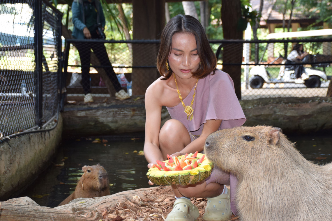 วันที่ 13 พ.ย.67 นายธนชน เคนสิงห์ ผู้อำนวยการสวนสัตว์นครราชสีมา เปิดเผยว่า สวนสัตว์นครราชสีมา จัดกิจกรรมเนื่องในโอกาสต้อนรับเทศกาลลอยกระทง เจ้าหน้าที่สวนสัตว์ได้ร่วมแต่งชุดผ้าไทย นำกระทงฟักทองทีแกะสลักอย่างสวยงาม ภายในกระทงโรยด้วยผักและผลไม้หลากหลายชนิด เสิร์ฟให้ครอบครัวหนูยักษ์คาปิบาร่า ได้กินกันอย่างเพลิดเพลิน ทั้งนี้เจ้าหน้าที่สวนสัตว์ ได้ร่วมกันรำวงบริเวณหน้าส่วนแสดงหนูยักษ์คาปิบาร่า เพื่อเป็นการสืบสานประเพณีไทยอันงดงาม และสร้างสีสันให้กับนักท่องเที่ยว ที่มาเที่ยวชมภายในสวนสัตว์นครราชสีมา