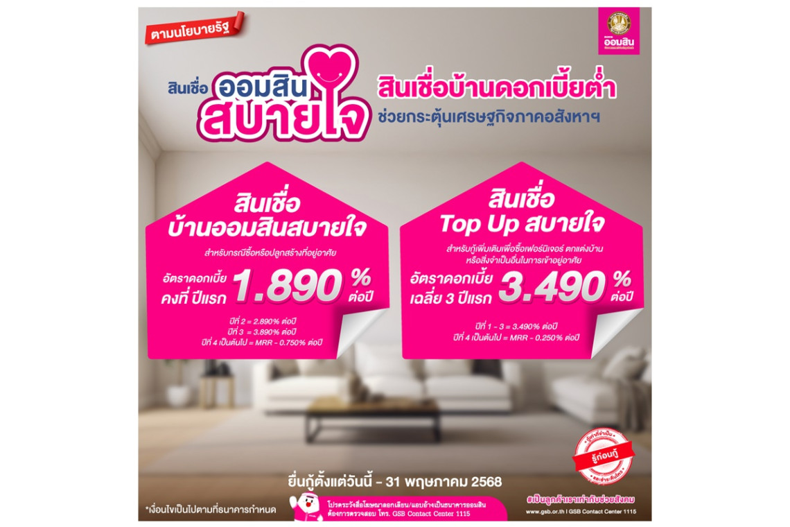 "ออมสิน" ออกสินเชื่อบ้านดอกเบี้ยต่ำตามมาตรการรัฐ ตั้งเป้ากระตุ้นเศรษฐกิจภาคอสังหาฯ กู้ซื้อ-สร้าง ดอกเบี้ยคงที่ปีแรก 1.89% ต่อปี กู้ตกแต่งดอกเบี้ยเฉลี่ย 3 ปีแรก 3.49% ต่อปี กู้ได้ถึง 31 พ.ค.68
