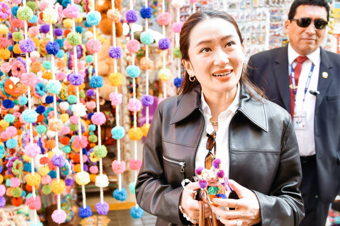 เมื่อเวลา 14.00 น. วันที่ 13 พ.ย.67 (ตามวันท้องถิ่น กรุงลิมา สาธารณรัฐเปรู ซึ่งช้ากว่าประเทศไทย 12 ชั่วโมง ) น.ส.แพทองธาร ชินวัตร นายกรัฐมนตรี เยี่ยมชม Inka Plaza ตลาดของฝากและสินค้าพื้นเมืองเปรูที่มีหลายประเภท ทั้งเครื่องเงิน หินสี กระเป๋าสาน และเครื่องแต่งกายจากขนอัลปากา ซึ่งเป็นเส้นใยจากสัตว์ของประเทศเปรู ผ้าที่เป็นที่นิยมของชาวเปรู ในโอกาสนี้ นายกฯ ได้ลองสวมเสื้อปอนโชเปรู ก่อนใช้ส่วนตัวซื้อเสื้อปอนโชเปรู ซึ่งเสื้อดังกล่าวเป็นเสื้อพื้นถิ่นของประเทศเปรูที่นักท่องเที่ยวนิยมซื้อเป็นของฝาก