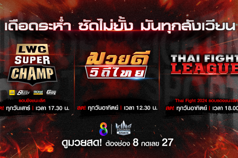 ดังนั้นห้ามพลาดชม 3 รายการมวยไทยสุดสัปดาห์ การันตีความมันที่สุดของประเทศใน รายการ LWC SUPER CHAMP (ลุมพินีเวิลด์ แชมเปี้ยนชิพ ซุปเปอร์แชมป์) ในวันเสาร์ที่ 16 พฤศจิกายน เวลา 17.30 น. พร้อมปิดท้ายในวันอาทิตย์ที่ 17 พฤศจิกายน กับรายการ มวยดีวิถีไทย เวลา 12.30 น. และ รายการ THAI FIGHT LEAGUE เวลา 18.00 น. ทางช่อง 8 กดเลข 27 ที่มีรายการมวยไทยมากที่สุด!