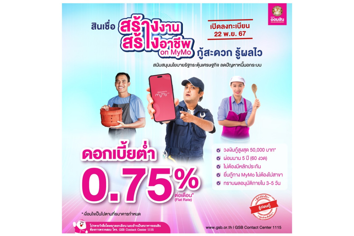 ออมสิน เดินหน้าช่วยรายย่อย เปิดให้กู้สร้างงานสร้างอาชีพ ดอกเบี้ยต่ำ 0.75% ต่อเดือน ไม่ต้องมีหลักประกัน ตั้งเป้าสนับสนุนนโยบายรัฐกระตุ้นเศรษฐกิจ ลดปัญหาหนี้นอกระบบ เริ่มลงทะเบียนทาง MyMo 22 พ.ย.นี้