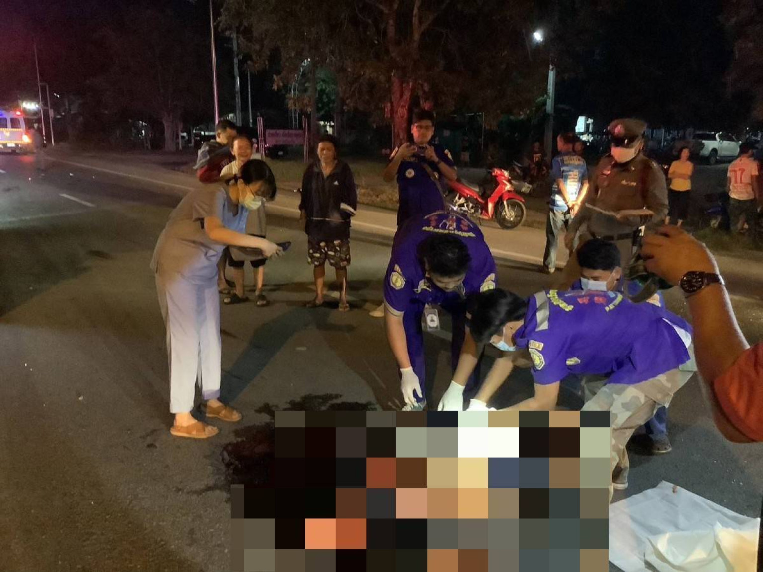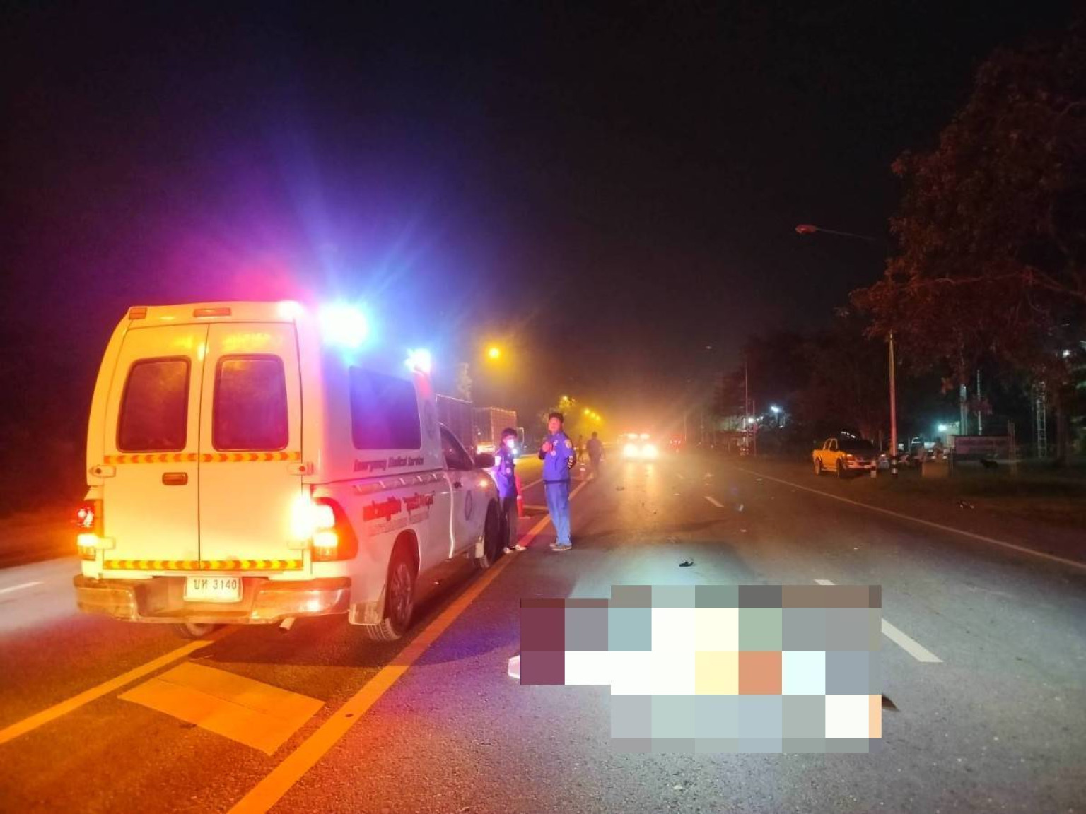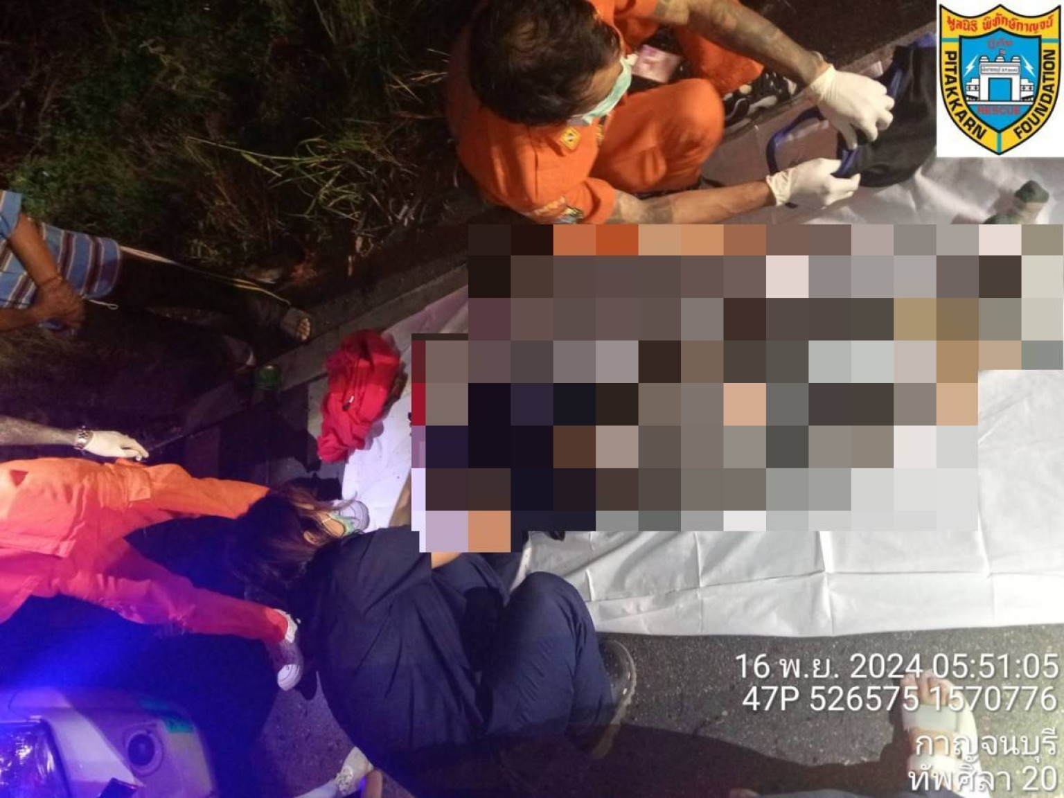 อุบัติเหตุรายที่ 2 เกิดขึ้นเวลา 04.26 น.ของวันเดียวกัน(16 พ.ย.67) ร.ต.อ.ธีรยุทธ อังวะ รองสารวัตรเวรสอบสวน สภ.ลาดหญ้า จ.กาญจนบุรี ได้รับแจ้งจากศูนย์วิทยุ สภ.ฯ ว่าเกิดอุบ้ติเหตุรถชนประสางากันมีผู้เสียชีวิต 1 ราย เหตุเกิดบนถนนสายกาญจนบุรี-ศรีสวัสดิ์ บริเวณหน้ามูลนิธิธรรมมานุรักษ์ ต.ช่องสะเดาฯ หลังรับแจ้งจึงเดินทางไปตรวจสอบที่เกิดเหตุ พร้อมประสานแพทย์เวร รพ.พหลพลพยุหเสนา ให้มาร่วมชันสูตรพลิกศพ พบว่า จุดเกิดเหตุมีเจ้าหน้าที่อาสาสมัครกู้ชีพของมูลนิธิพิทักษ์กาญจนบุรี ประจำจุดต.วังด้ง รถทัพศิลา 01ร่วมกับรถ น.เขต 01 จากสำนักงานใหญ่ของมูลนิธิฯ ออกปฎิบัติหน้าที่อยู่ในที่เกิดเหตุเพื่อรอเป็นผู้ช่วยเจ้าหน้าที่ตำรวจและแพทย์ในการชันสูตรพลิกศพ