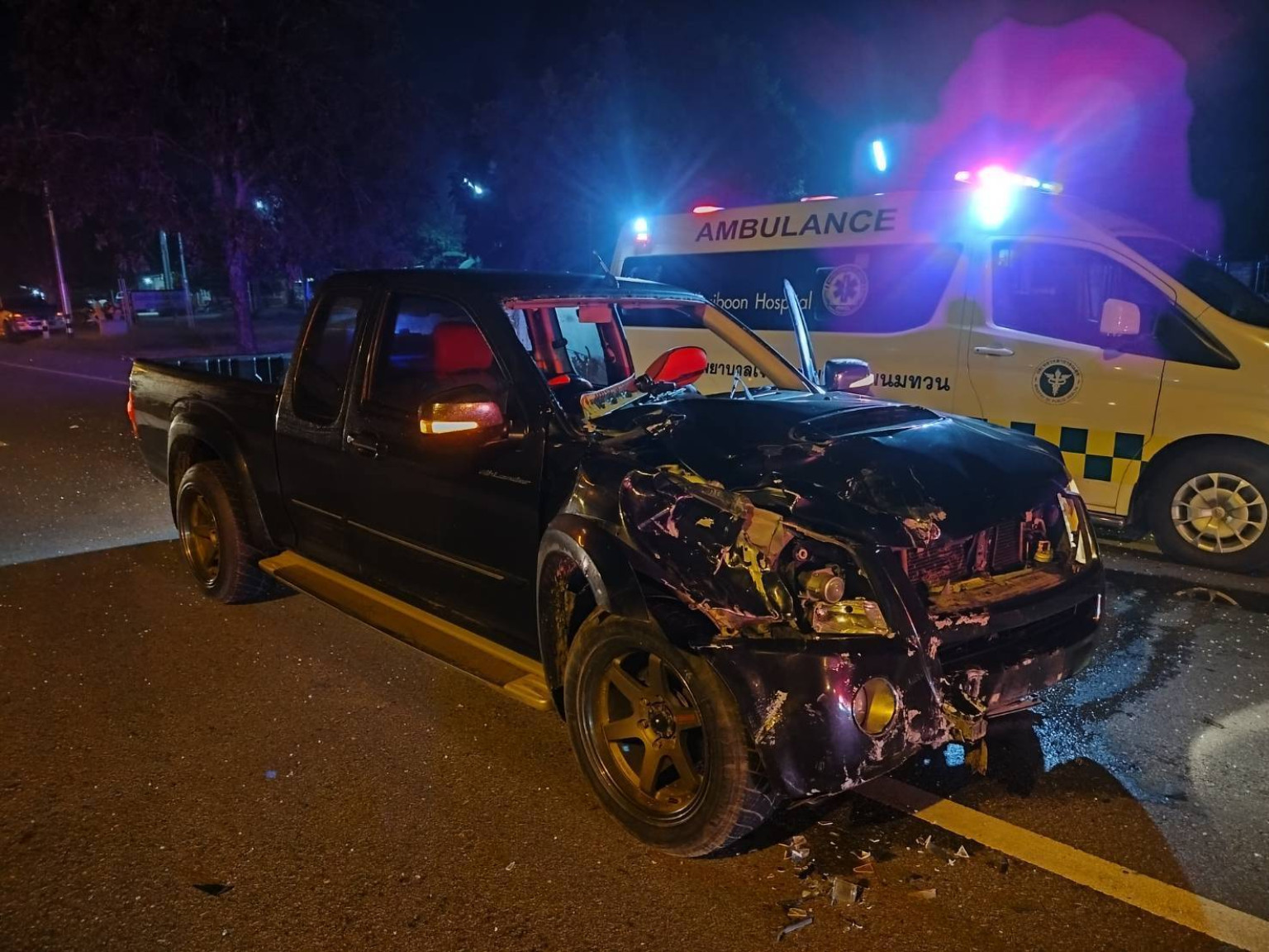 จุดเกิดเหตุพบรถจักรยานยนต์ยี่ห้อฮอนด้าดรีม รุ่นซุปเปอร์คัพสีชมพู หมายเลขทะเบียน 1กฎ 3480 กาญจนบุรี จอดอยู่ในสภาพตัวรถขาด 2 ท่อน ห่างออกไปประมาณ 200 เมตรพบรถรถยนต์กระบะอีซูซุ(รุ่นเก่า)สีดำ หมายเลขทะเบียน บษ.4829 กาญจนบุรี จอดอยู่ในสภาพด้านหน้าขวามีร่องรอยเฉี่ยวชนจนพังเสียหาย เศษชิ้นส่วนแตกหักกระจายเกลื่อนพื้น