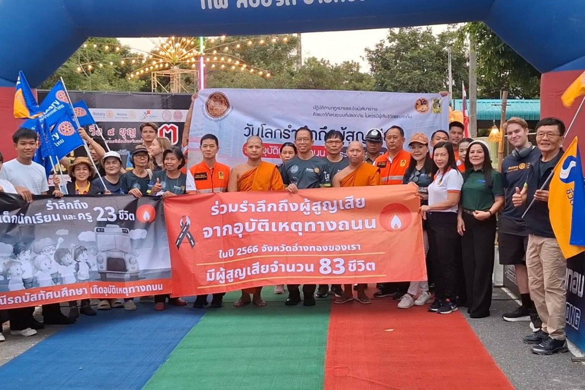 วันที่ 17 พฤศจิกายน 2567 เวลา 06.00 น. ที่บริเวณวัดไร่ อำเภอวิเศษชัยชาญ จังหวัดอ่างทอง นายทัศนัย สุธาพจน์ รองผู้ว่าราชการจังหวัดอ่างทอง เป็นประธานจัดกิจกรรมวันรำลึก "เหยื่อโลก"หวังทุกฝ่ายร่วมใช้ทางปลอดภัย ไม่ต้องสูญเสียคนที่รัก-เกิดความปลอดภัยในการเดินทาง โดยมีนายบรรจง โพธิวงค์ หัวหน้าสำนักงานป้องกันและบรรเทาสาธารณภัยจังหวัดอ่างทอง วงศพัฒน์ เงินอนันตสุขแผนงานสนับสนุนการป้องกันอุบัติเหตุจราจรระดับจังหวัด (สอจร.จ.อ่างทอง) สมาชิกโรตารี่อ่างทอง-สระบุรี พี่น้องประชาชน นักเรียน เข้าร่วมในกิจกรรม
