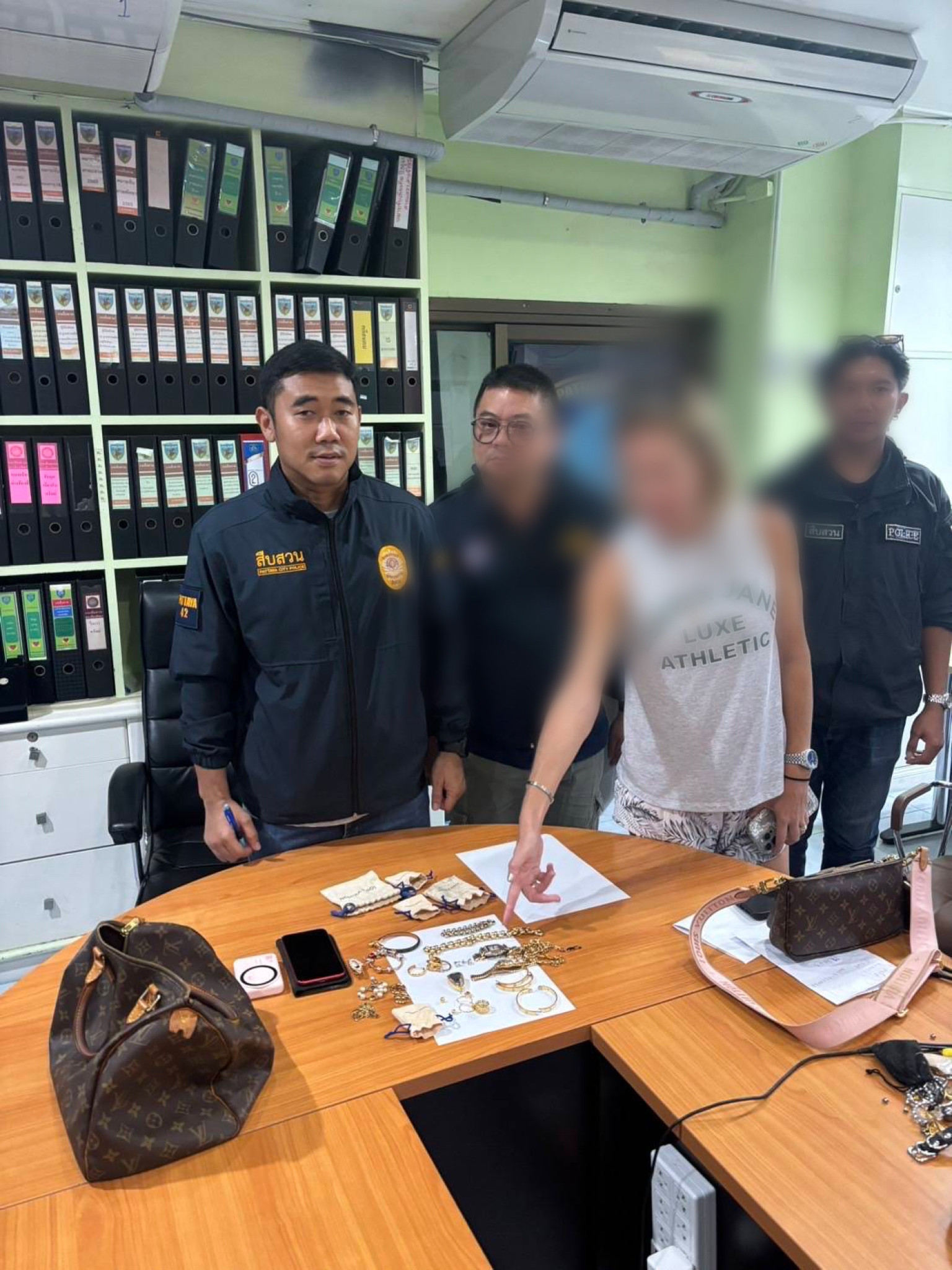 ตรวจค้นพบของกลางเครื่องประดับยี่ห้อหรู มูลค่ากว่า 3.5 ล้านบาท ซึ่งเป็นของผู้เสียหาย ได้อย่างครบถ้วน ซุกซ่อนอยู่ในกระเป๋าสัมภาระ จึงควบคุมตัวมาสอบสวน พร้อมประสานพิสูจน์หลักฐานเข้าเก็บดีเอ็น ประกอบหลักฐานในการดำเนินคดี โดยมี น.ส.แอนนี่ นักธุรกิจสาว เดินทางมาตรวจสอบทรัพย์สิน ด้วยสีหน้าที่ยิ้มแย้ม พร้อมทั้งกล่าวชื่นชมตำรวจชุดจับกุม เพียงไม่กี่ชั่วโมงสามารถรวบตัวคนร้ายได้อย่างรวดเร็ว