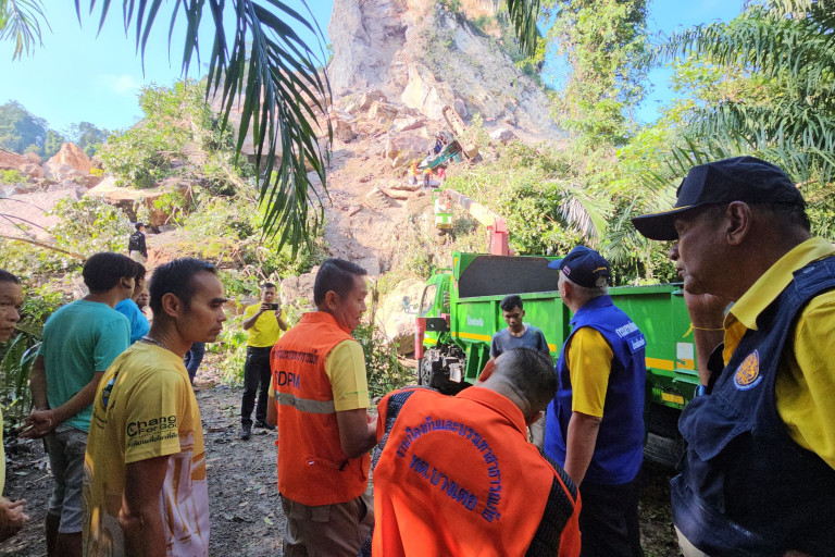 เบื้องต้นนายพีระเดช หลีน้อย นายกเทศมนตรีตำบลบางเตย บอกว่า คนขับรถแบคโฮได้รถมาล้างในบริเวณใกล้เคียงและกำลังขับกลับไปยังบ่อขยะของเทศบาล และได้เกิดเหตุหินบนภูเขาถล่มลงมาทับจนเสียชีวิตดังกล่าว