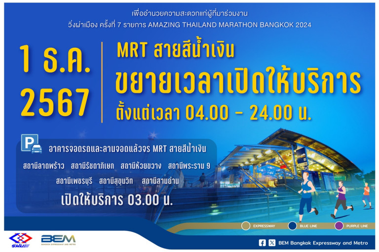 เมื่อวันที่ 19 พ.ย.67 การรถไฟฟ้าขนส่งมวลชนแห่งประเทศไทย (รฟม.) ร่วมกับบริษัททางด่วนและรถไฟฟ้ากรุงเทพ จำกัด (มหาชน) หรือ BEM ผู้ให้บริการทางพิเศษและรถไฟฟ้า MRT สายสีน้ำเงินและสายสีม่วง ร่วมสนับสนุนการแข่งขันวิ่งมาราธอนส่งเสริมการท่องเที่ยวระดับโลก "วิ่งผ่าเมือง ครั้งที่ 7" Amazing Thailand Marathon Bangkok 2024 โดยจะขยายเวลาการเปิดให้บริการ MRT สายสีน้ำเงิน ในวันอาทิตย์ที่ 1 ธันวาคม 2567 ตั้งแต่เวลา 04.00 น.
