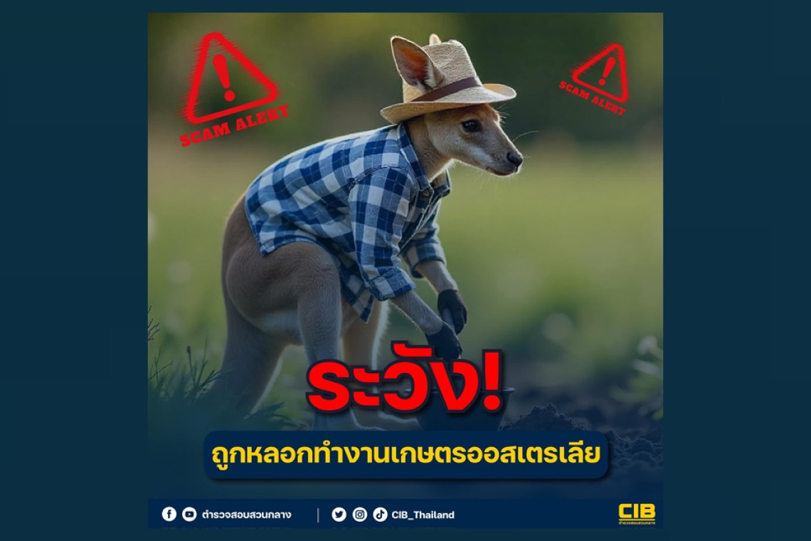 เมื่อวันที่ 19 พ.ย.67 เพจ ตำรวจสอบสวนกลาง แจ้งว่า ขณะนี้มีแก๊งมิจฉาชีพโฆษณาบนสื่อออนไลน์ ชักชวนไปทำงานฟาร์มในออสเตรเลีย แอบอ้างว่ารัฐบาลออสเตรเลียและกระทรวงแรงงาน ร่วมมือในการจัดหาคนไทยไปทำงานในออสเตรเลีย โดยจะได้รับวีซ่าประเภททำงานเป็นระยะเวลา 3-5 ปี ได้รับค่าจ้างเดือนละ 90,000 - 120,000 บาท และนายจ้างจ่ายค่าดำเนินการ ค่าตั๋วเครื่องบิน ค่าวีซ่า พร้อมจัดหาที่พักให้ฟรีตลอดระยะทำงาน