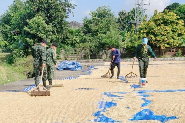 มณฑลทหารบกที่ 37 จัดกำลังพลจิตอาสาพระราชทาน จัดกิจกรรม “ช่วยด้วยใจ ลดรายจ่าย สร้างรายได้” ช่วยเกษตรกรตากเมล็ดข้าวเพื่อเก็บไว้สำหรับบริโภค บ้านไร่ ตำบลแม่เงิน อำเภอเชียงแสน จังหวัดเชียงราย